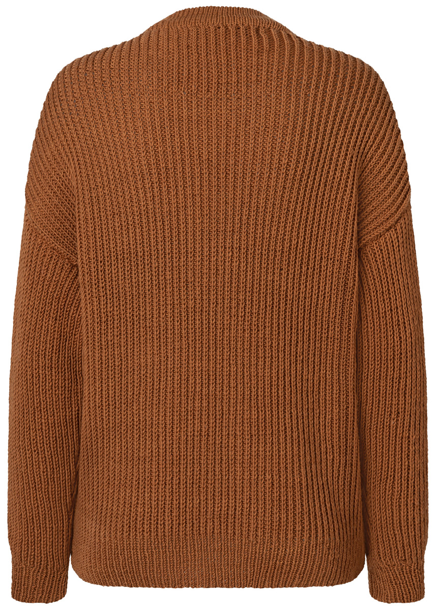 Lana Grossa Country Tweed (100% ren ny ull, löplängd 90 m/50 g), 800 (850 – 900) g mokka melerad (färg 10); stickor nr. 5,5 och 6 knappar från UNION KNOPF, färg ljus brun, Ø 22 mm.