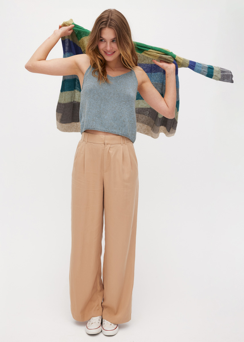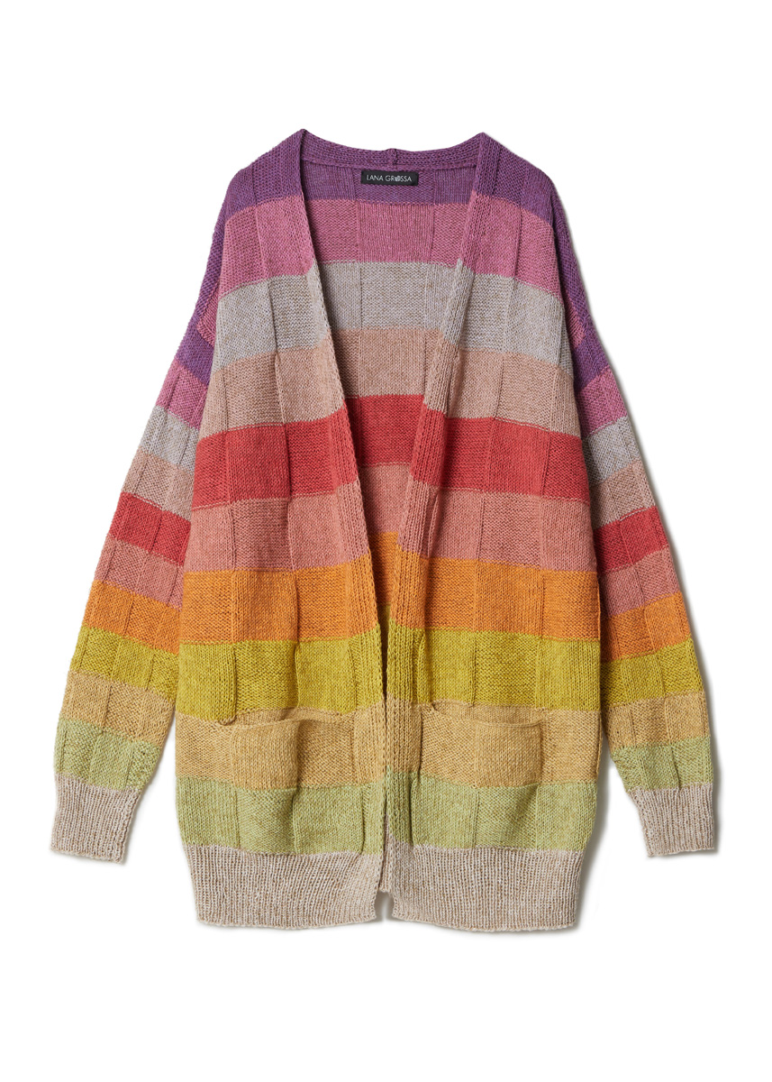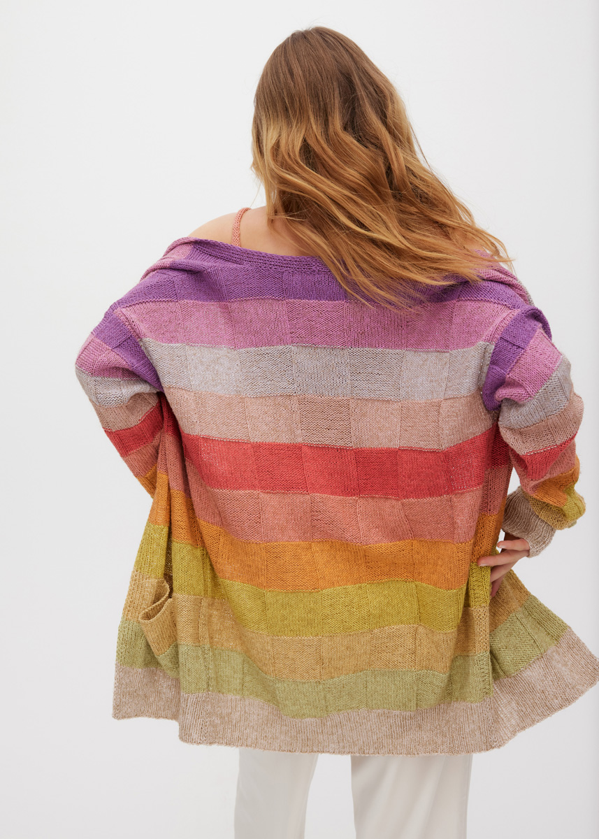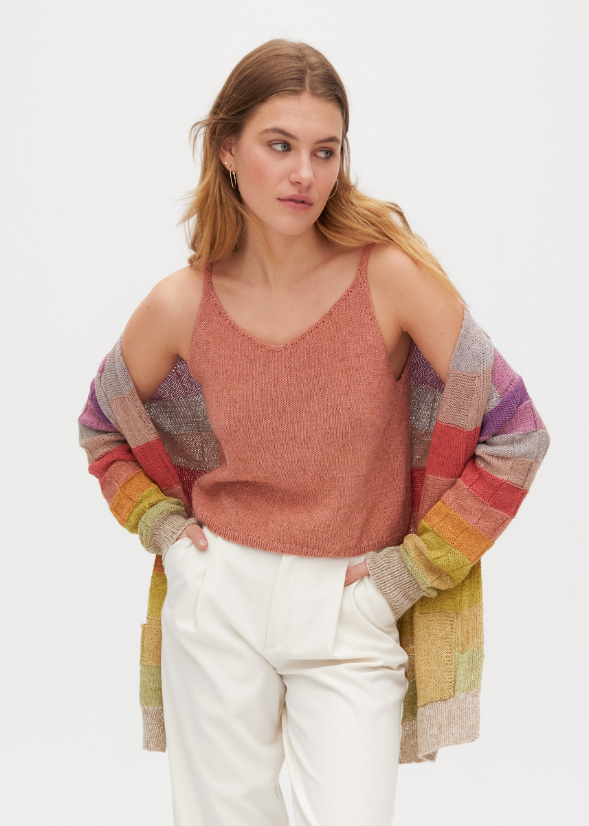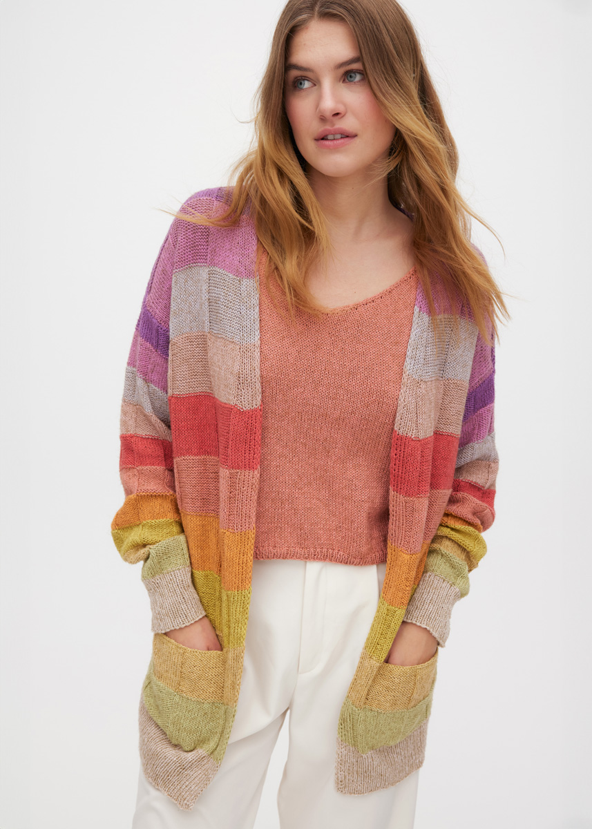 Lana Grossa „Diversa“ (74% bomull, 26% viskos, löplängd = 210 m/50 g) färgvariant A: 50 g var i lin (färg 6), gulgrön (färg 11), ljusgul (färg 13), curry (färg 12), orange (färg 21), terrakotta (färg 4), roströd (färg 22), rosenträ (färg 5), rosabeige (färg 2), bär (färg 3) och plommon (färg 20) och ytterligare 50 g i ljusgul (färg 13); färgvariant B: 50 g var i natur (färg 7), ljusgrå (färg 14), mörkgrå (färg 15), mint (färg 9), opalgrön (färg 18), blågrå (färg 8), gråblå (färg 16), bläckblå (färg 17), grågrön (färg 10), gulgrön (färg 11) och gräsgrön (färg 19), och ytterligare 50 g i mörkgrå (färg 15); stickor nr. 3 och nr. 3,5, 1 rundsticka nr. 3, 40 cm lång.