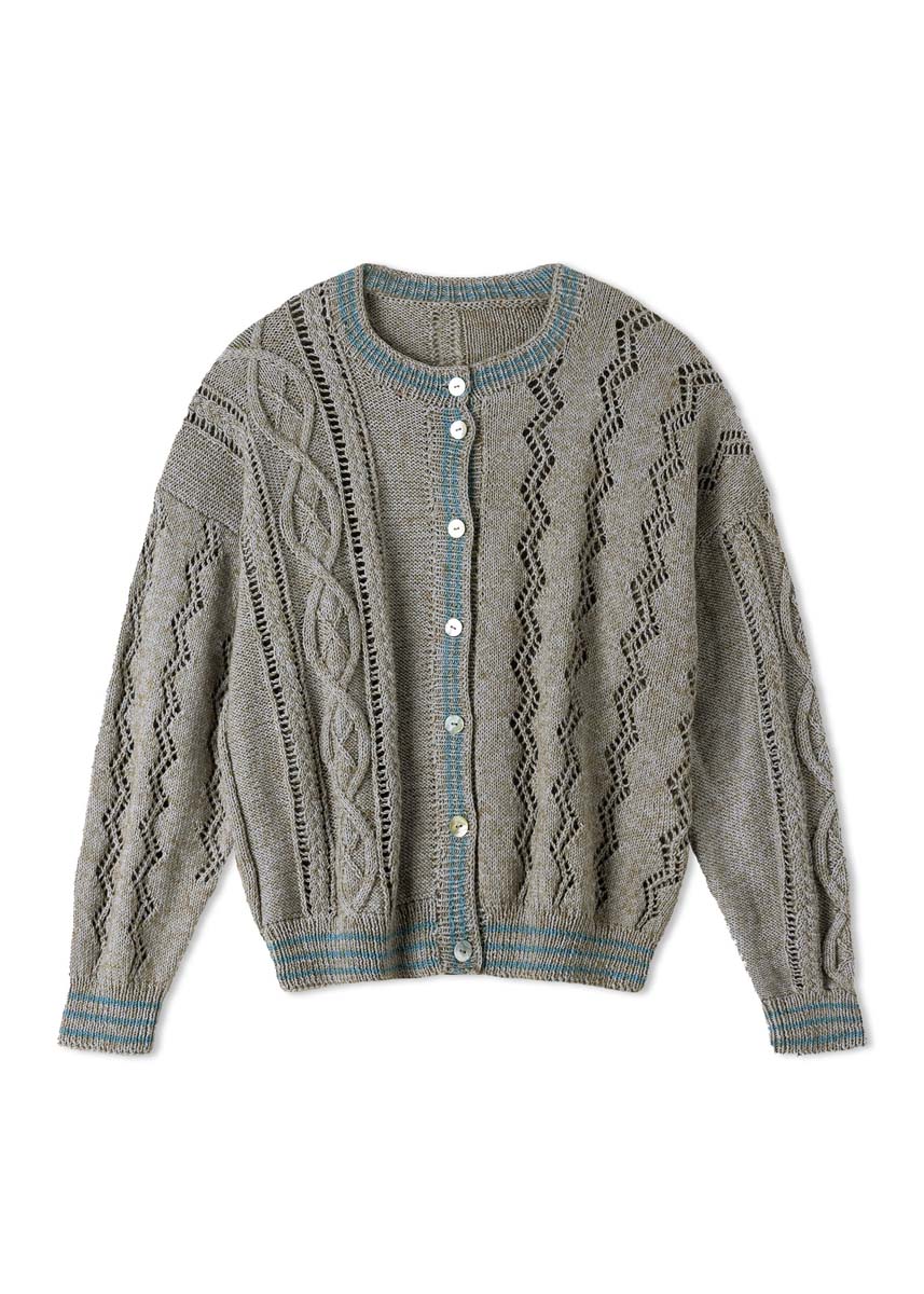 Lana Grossa Diversa (74% bomull, 26% viskose, løpelenge 210 m/50 g), 350 (400 – 450) g lysgrå (farge 28) og 50 g gråblå (farge 16); pinner nr. 2,5 og 3,5, samt 1 rundpinne nr. 2,5, 60 cm lang, 1 flettepinne og 7 knapper fra UNION KNOPF, Art. 37604, farge 12, Ø 15 mm.