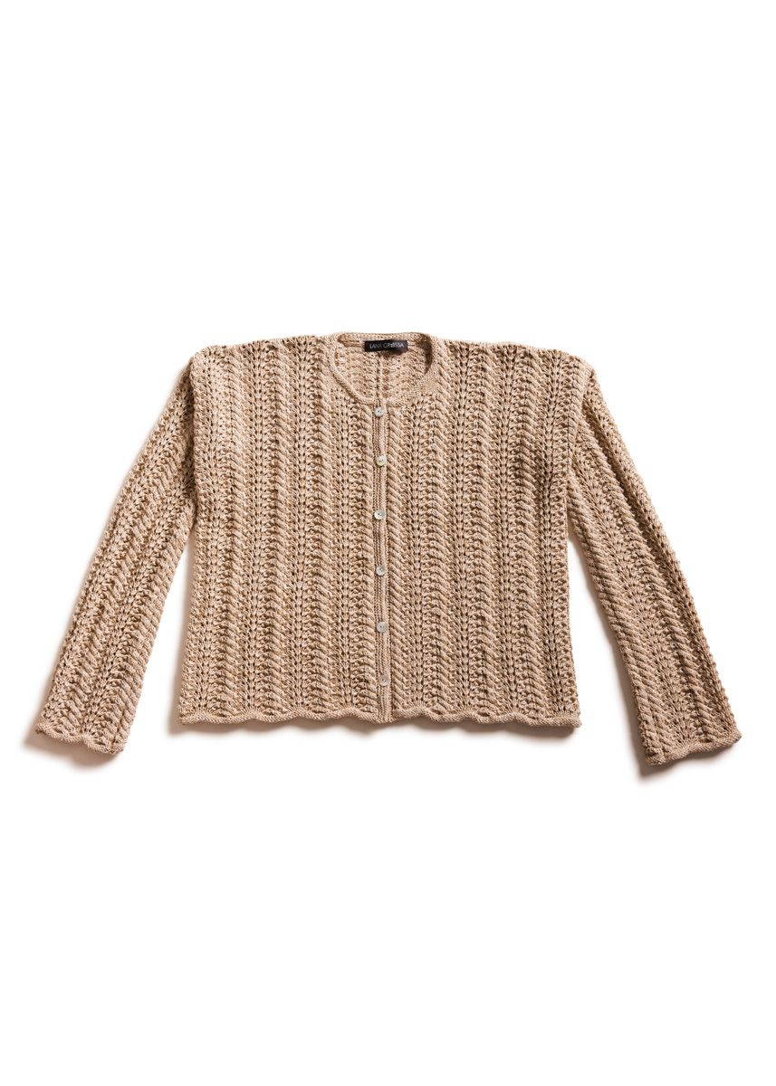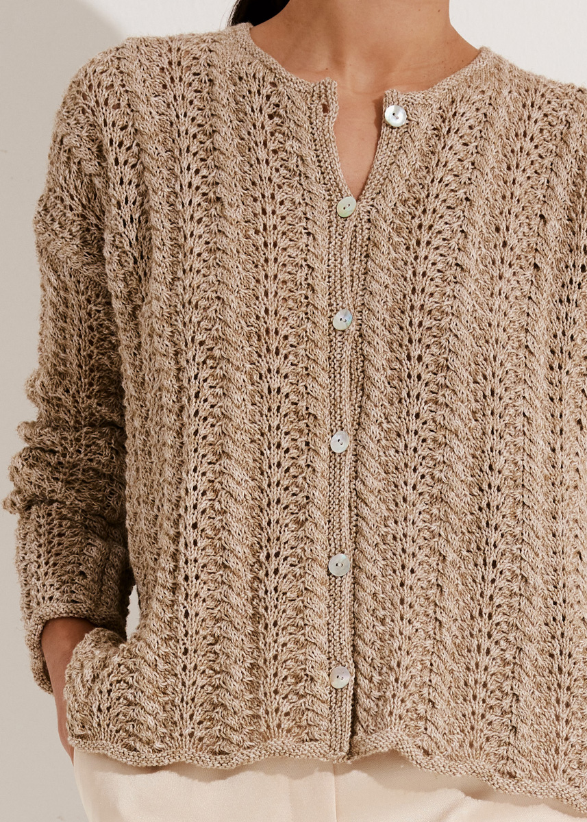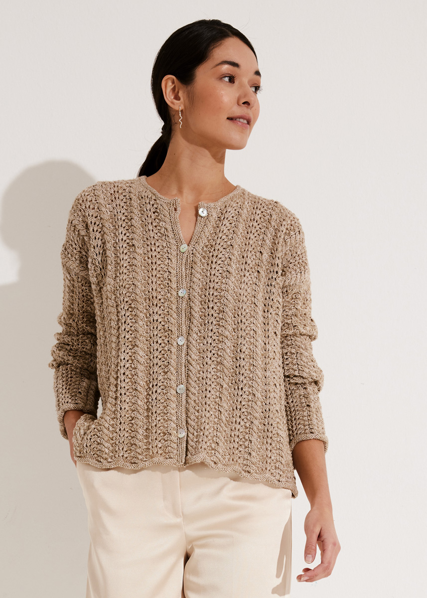 Lana Grossa-kvalitet „Diversa“ (74 % bomull, 26 % viskos, löplängd = ca. 210 m/50 g): ca. 450 g i lin (färg 6); stickor nr. 3,5, 1 rundsticka nr. 3,5, 50 cm lång; 1 flät- eller hjälpsticka; 6 pärlemor-knappar från Union Knopf, 15 mm Ø.
