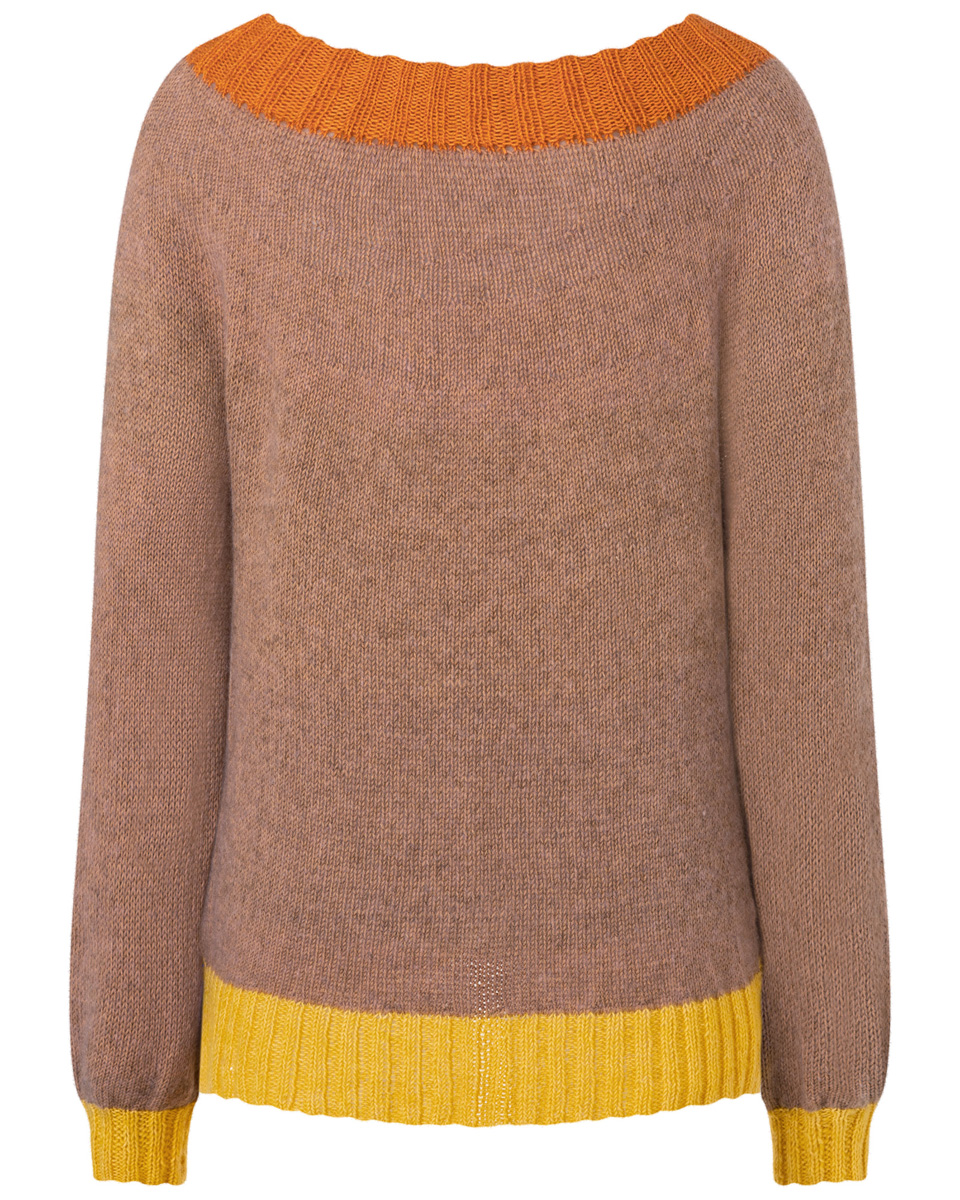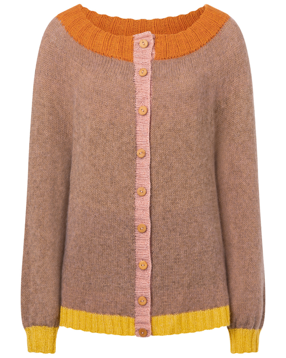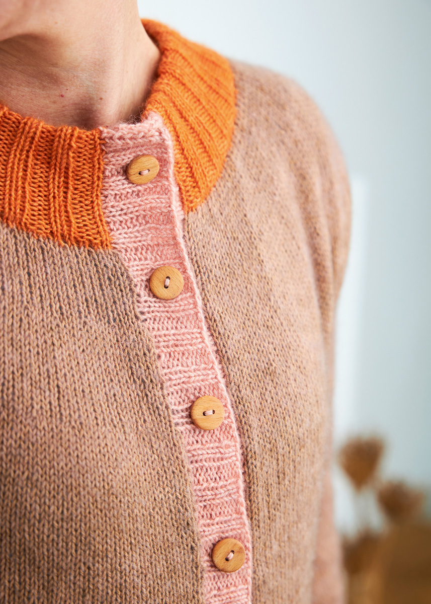 Lana Grossa-kvalitet ”Ecopuno” (72 % bomuld, 17 % ren ny uld (merino), 11 % (baby) alpaka, løbelængde = ca. 215 m / 50 gr.): 250(250)250(300)300(350)350(350) gr i farve 32 camel (hovedfarve hf) 50 gr, alle str. i farve 5 jaffaorange (kontrastfarve 1 kf1) 50 gr, alle str. i farve 52 lysegul (kontrastfarve 2 kf2) 50 gr, alle str. i farve 7 fersken (kontrastfarve 3 kf3)