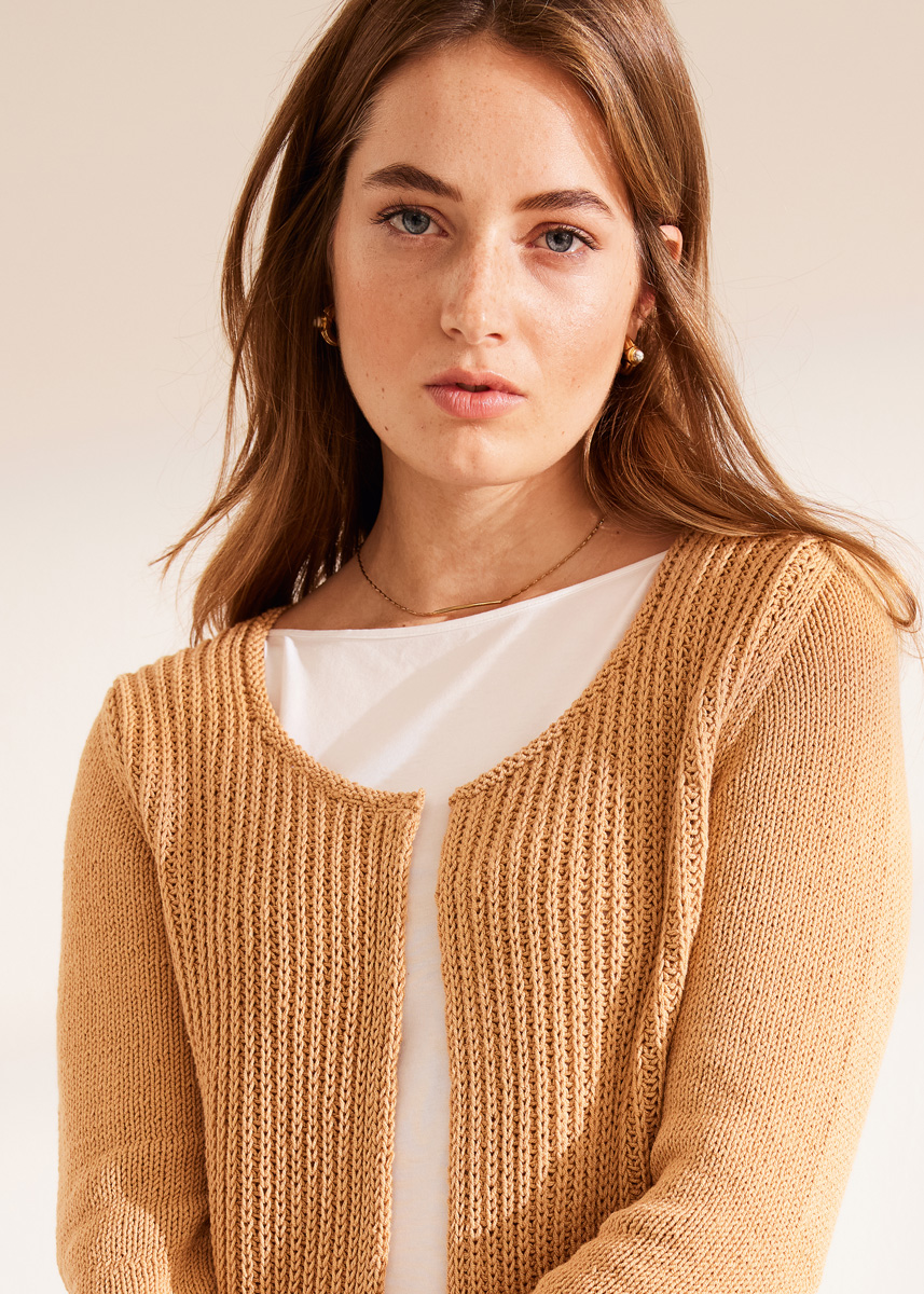Lana Grossa Elastico (96% bomull, 4% polyester (elité), löplängd 160 m/50 g), 500 (550 – 600) g kamel (färg 177); stickor nr. 4 och 4,5, 1 rundsticka nr. 4, 40 cm lång.