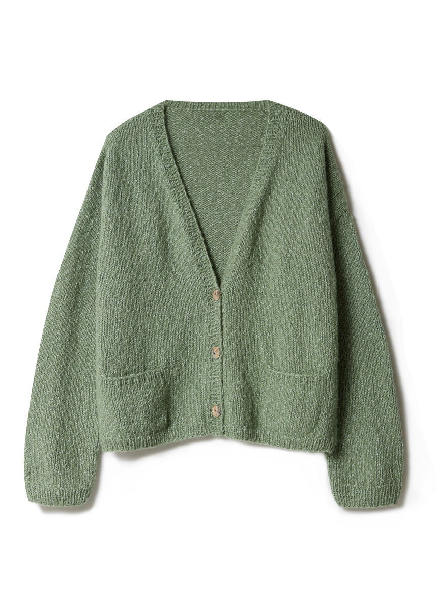 Lana Grossa „Fantasia“ (50% bomull, 24% viskos, 16% alpacka (baby), 10% ren ny ull (merino extrafin), löplängd 125 m/50 g) 450 (500 – 550) g salviagrön (färg 12); stickor nr. 4,5 och 5, 1 rundsticka nr. 4,5, 100 cm lång, 3 knappar från UNION KNOPF, Art. 37604, färg 12, Ø 20 mm.