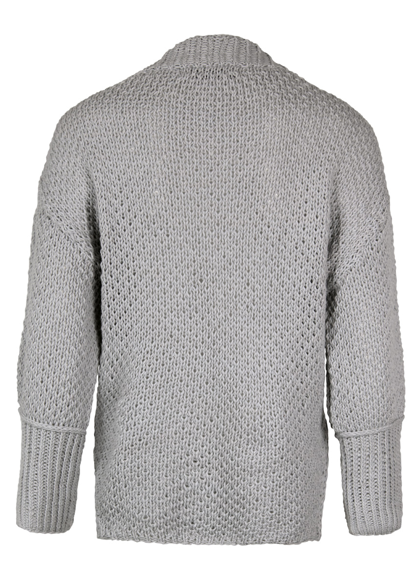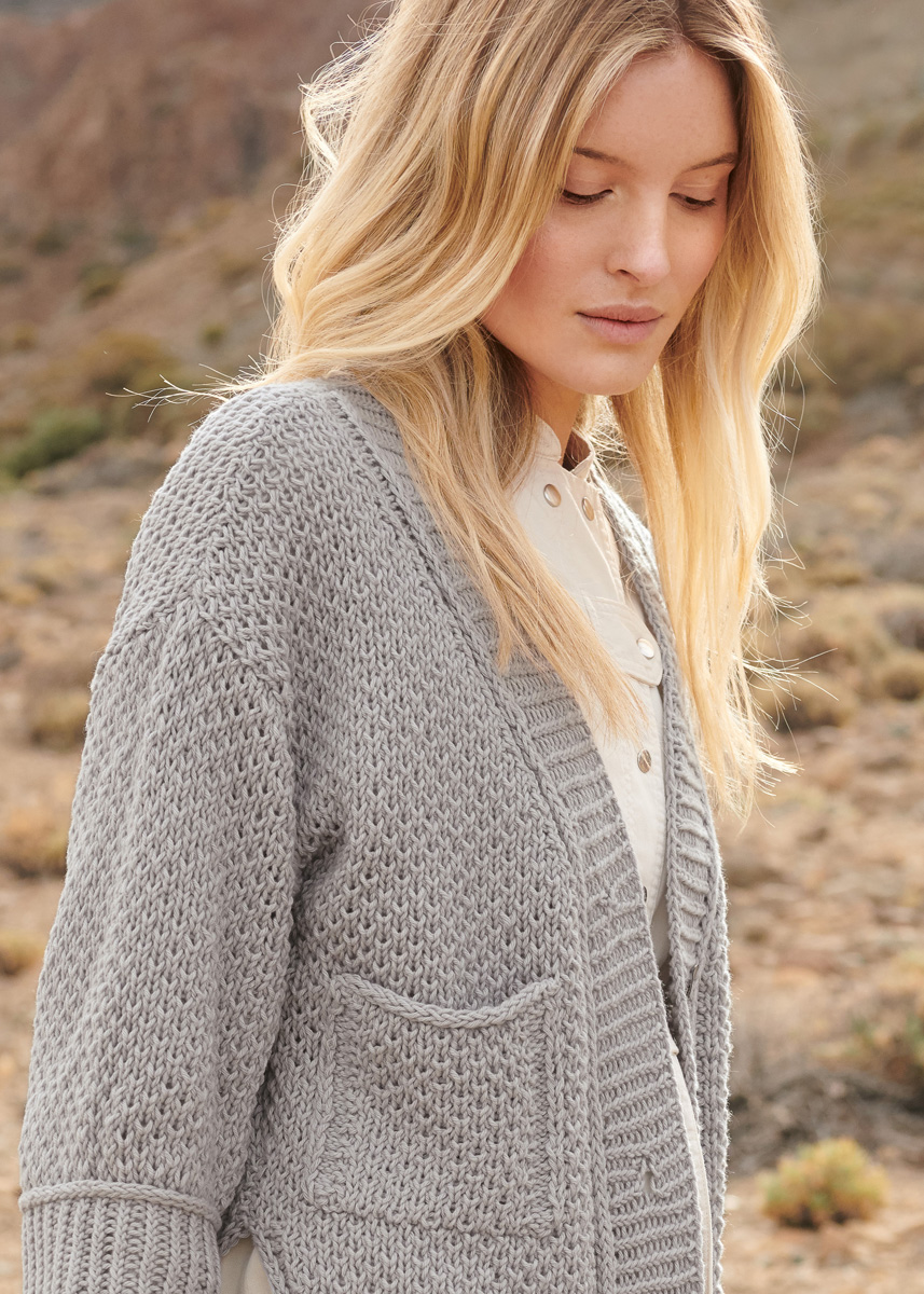 Lana Grossa-kvalitet „Fourseason” (45 % ekologisk ren ny ull (merino extrafine), 40 % ekologisk bomull, 15 % återvunnen kashmir, löplängd = ca. 105 m/50 g): ca. 400 (450) g ljus grå (färg 26); stickor nr. 5 och 6, 1 rundsticka nr. 5, 120 cm lång; 3 pärlemor knappar från Union Knopf, Art. 453708, 2-hål, färg 76 grå, ø 25 mm.
