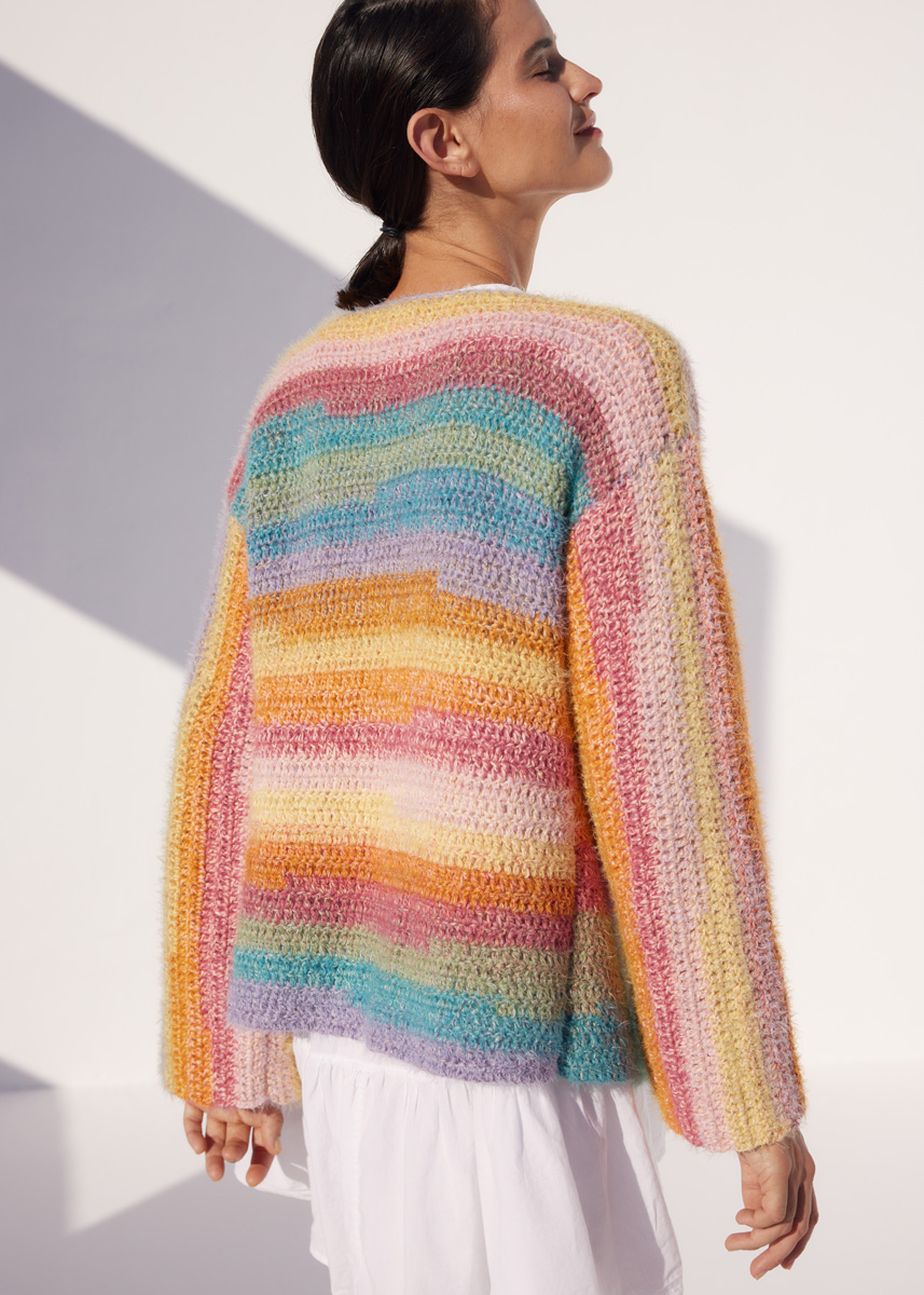 Lana Grossa-kvalitet „Gomitolo Collina“ (72 % (bio) bomull, 28 % viskos, löplängd = ca. 260 m/100 g): ca. 400 (500-500) g i vanilj/rosa/antikviolett/grågrön/gråbrun/terrakotta (färg 1014) och Lana Grossa-kvalitet „Per Fortuna“ (74 % bomull, 26 % polyamid, löplängd = ca. 190 m/50 g): 50 g var i orange (färg 11), turkos (färg 26), gul (färg 32), lila (färg 35), rosé (färg 36), ljung (färg 38) och lindgrön (färg 43); 1 virknål nr. 5. Tips: Virka allt med dubbla trådar, 1 tråd Gomitolo Collina och 1 tråd Per Fortuna.