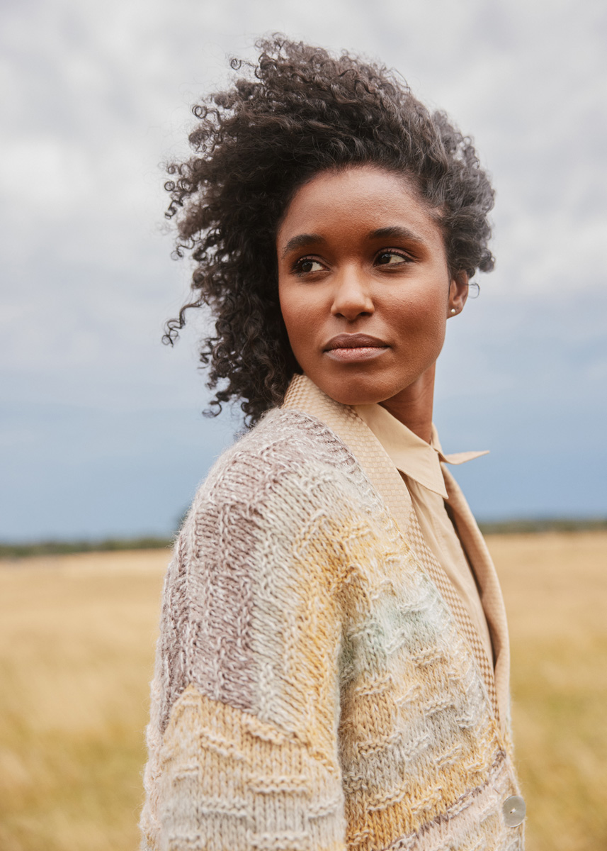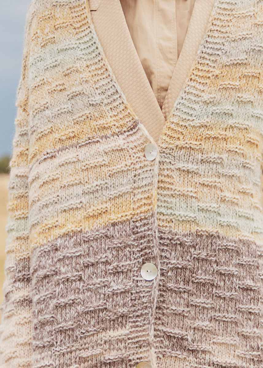 Lana Grossa-kvalitet „Gomitolo Dipinto“ (60 % ren ny ull, 40 % polyacryl, löplängd = ca 700 m/200 g): 2 (2 - 2 - 3) nystan = ca 400 (400 - 400 - 600) g senapsgul/gråbrun/natur/mint (färg 2011) och „Bella“ (35 % bomull, 30 % nylon, 25 % alpacka (baby), 10 % ren ny ull (merino), löplängd = ca 250 m/25 g): 4 (5 - 6 - 7) nystan = ca 100 (125 - 150 - 175) g råvit (färg 1); stickor nr. 5 och 5,5; 4 pärlemor-knappar i råvit, diameter 25 mm. Cardiganen stickas med dubbla trådar - 1 tråd av var garn-kvalitet.