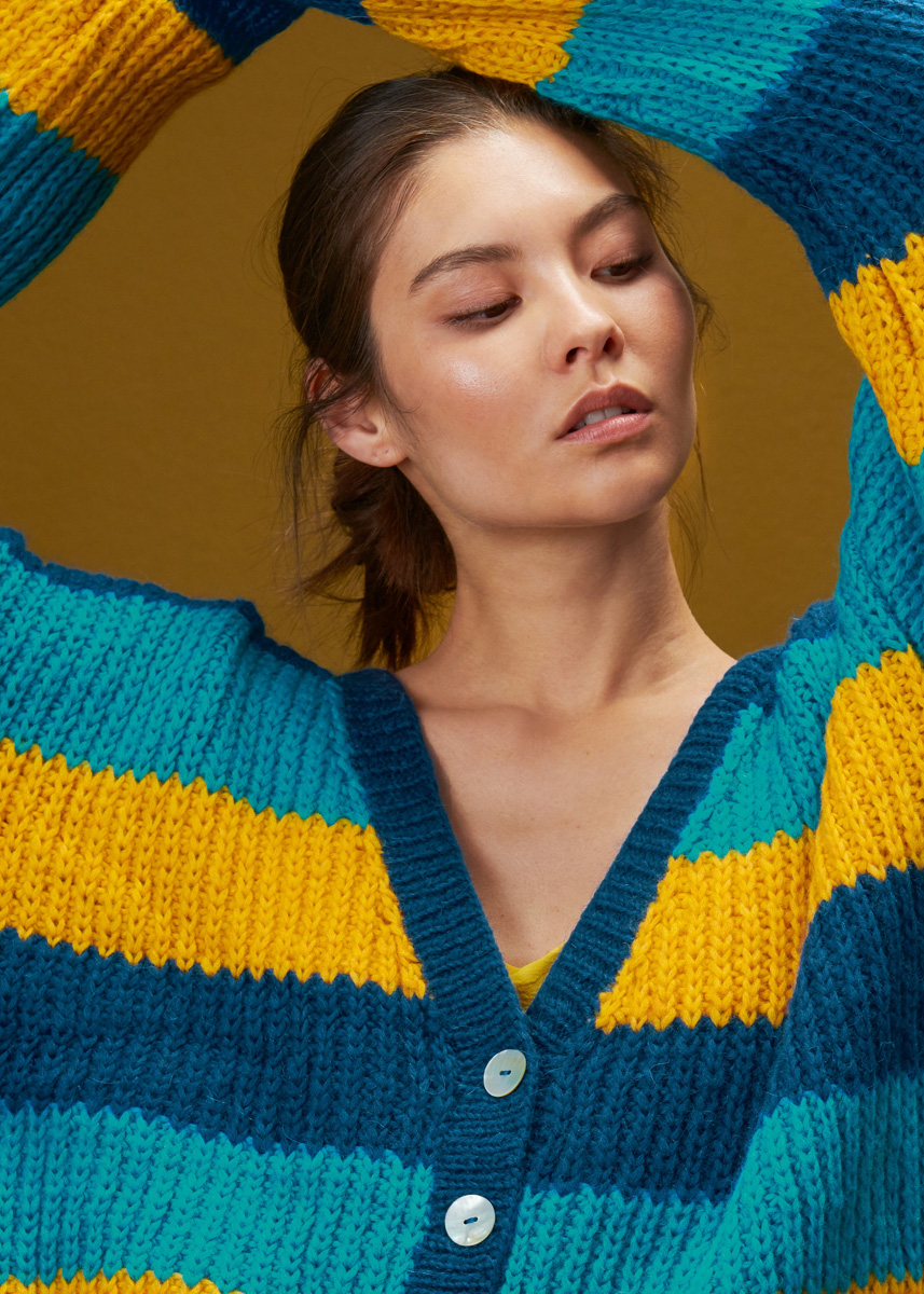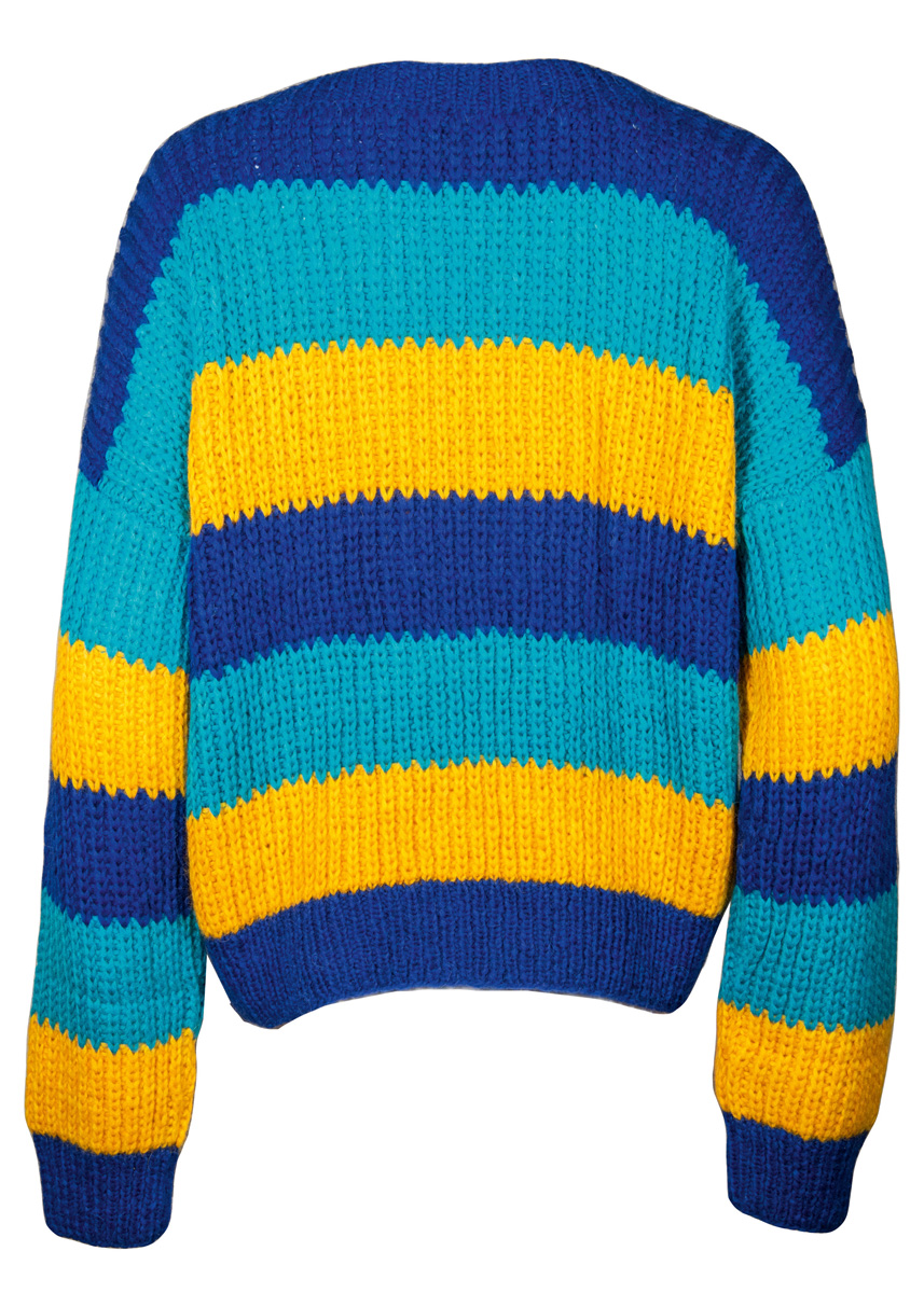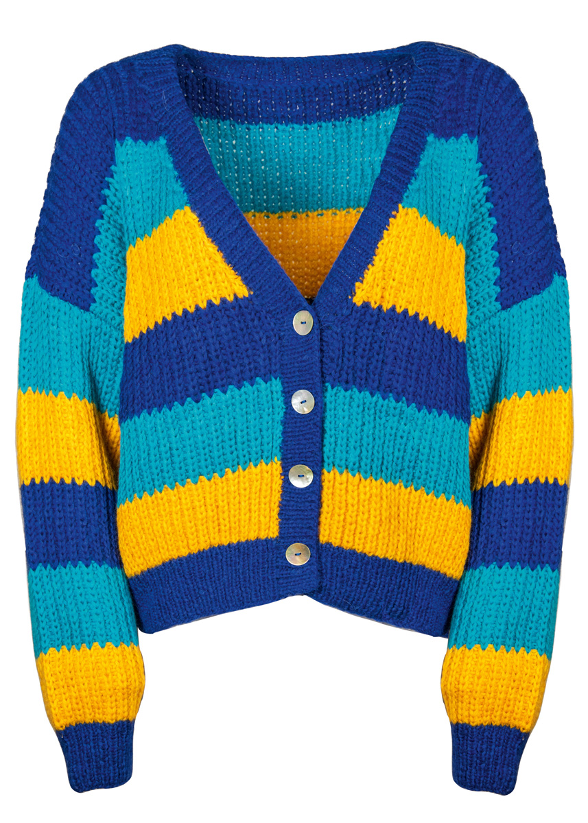 Lana Grossa-kvalitet „Brigitte No. 2” (47 % (baby) alpakka, 45 % bomull, 8 % ren ny ull (merino), løpelengde = ca. 140 m/50 g): ca. 200 g blekkblå (farge 30) og ca. 150 g hver av eggplommegul (farge 31) og tyrkis (farge 29); strikkepinner nr. 4 og 5, 1 rundpinne nr. 4, 120 cm lang; 4 perlemorknapper fra Union Knopf, Art. 37604, ø 23 mm, farge 12 natur.