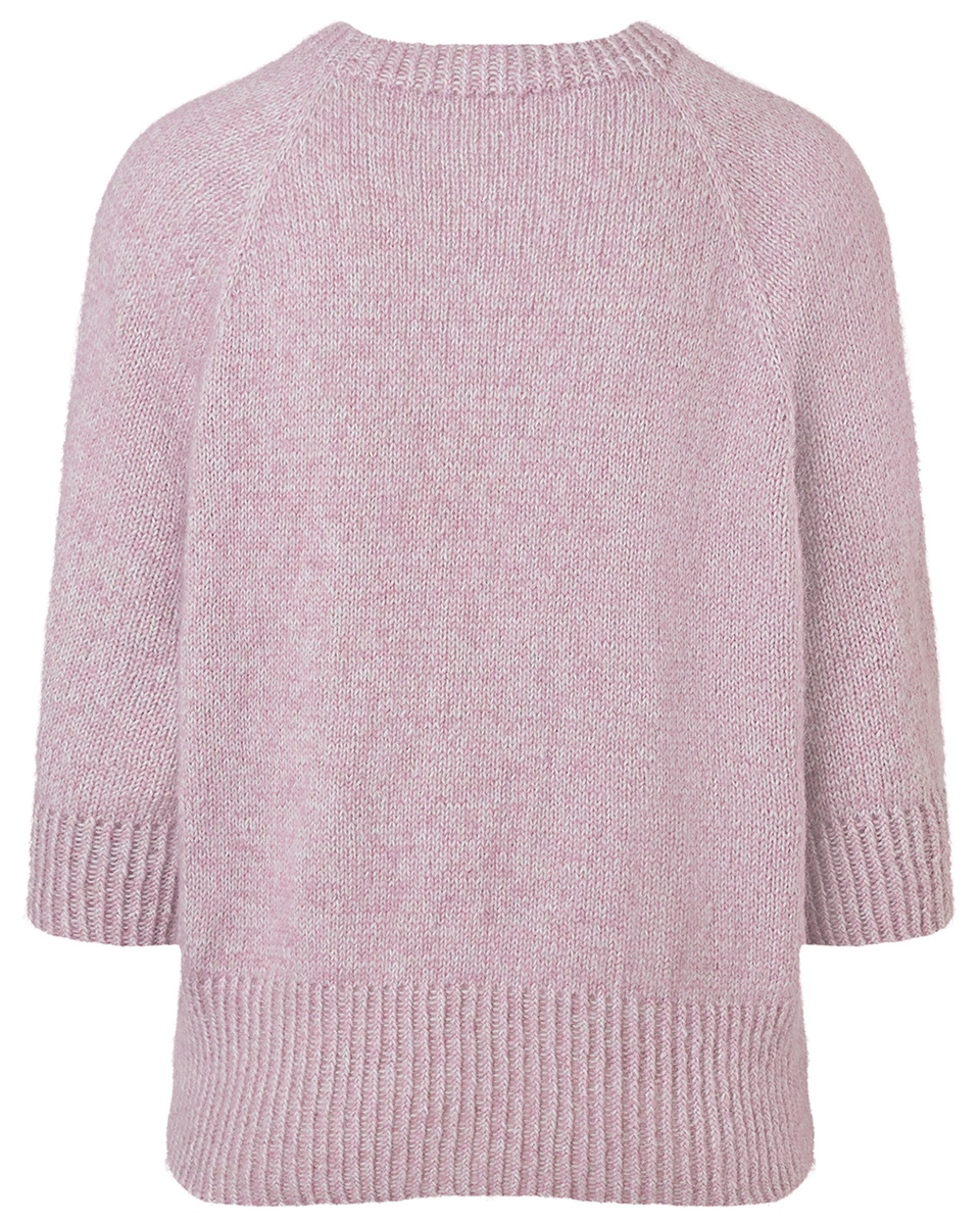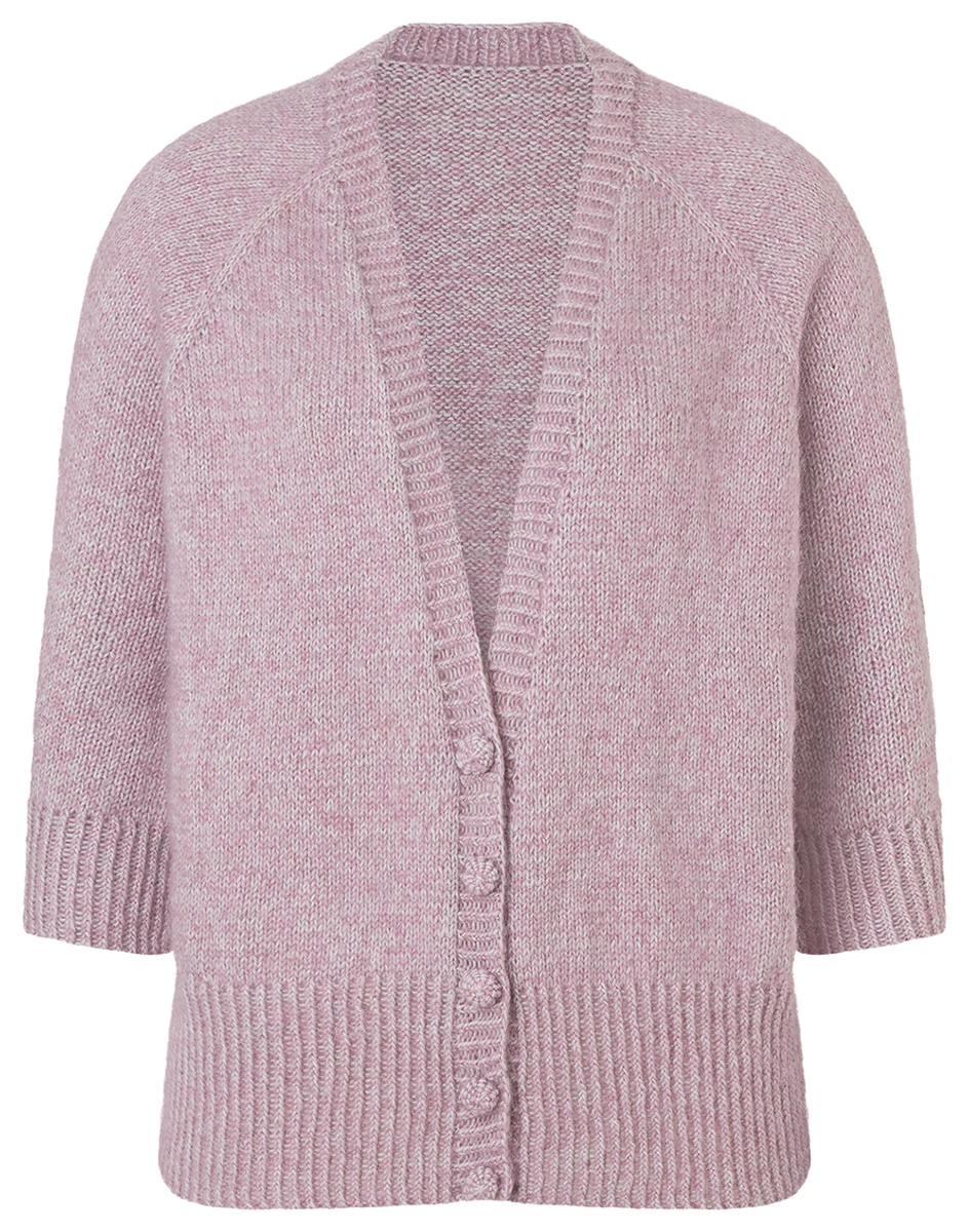 Variant 2: Lana Grossa-kvalitet ”Ecopuno” (72 % bomuld, 17 % ren ny merino, 11 % baby alpaka, løbelængde = ca. 215 m / 50 gr.): ca. 200 (200-200-250-250-300) gr sølvgrå (fv 45 = Garn 1), Lana Grossa-kvalitet ”Silkhair” (70 % (superkid) mohair, 30 % silke, løbelængde = ca. 210 m / 25 gr.): ca. 100 (100-125-150-150-175) gr lys lilla (fv 87 = Garn 2), rundpind nr. 2,75 og 3, 80-100 cm lang til kroppen og kort rundpind eller strømpepinde nr. 2,75 og 3 til ærmerne, maskeholdere, 4 maskemarkører (= mm), 5 knapper på 13-15 mm Ø, stoppenål, saks.