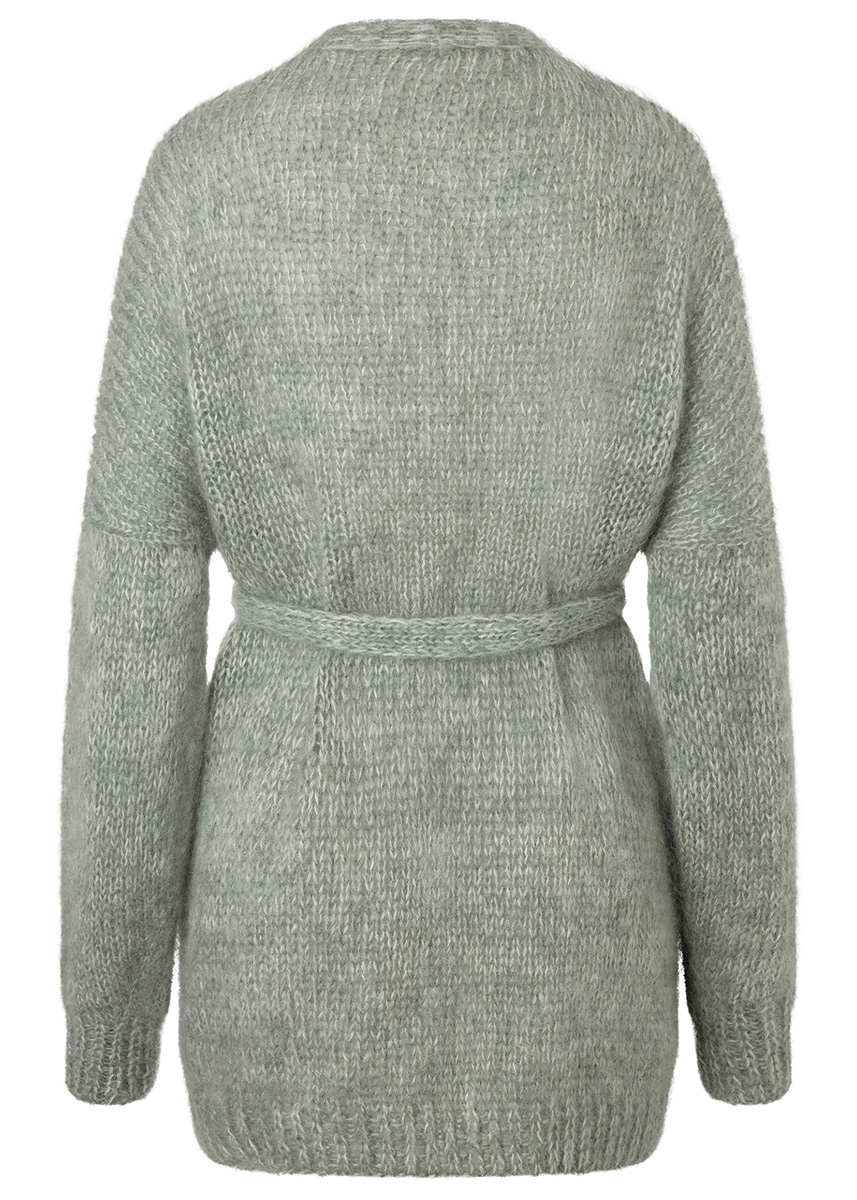 Vid cardigan med bælte. Denne cardigan strikkes samlet oppefra og ned. Der begyndes med halskanten bag, og derefter formes forstykkerne med skuldre i vendepinde. Der strikkes udtagninger til den dybe V-hals og indtagninger til de skrå ærmegab. Derefter strikkes ryggen. Til sidst strikkes forstykkerne og ryggen sammen. Ærmerne strikkes direkte på ærmegabene. Via indtagninger får ærmerne et let ballonformet snit og strammes ind ved ærmekanterne. Alle kanter samt bæltet strikkes i vævestrik. Str.: XS (32/34) - S (36/38) – M (40/42) – L (44/46) – XL (48/50) – XXL (52/54) Disse str. svarer til en overvidde på XS (76-80) cm – S (84-88 cm) – M (92-96 cm) – L (100-104 cm) – XL (110-116 cm) – XXL (122-128 cm) Jona Cardiganen har en ekstra vidde på XS (42-38 cm) – S (20- 38 cm) – M (44-40 cm) – L (44-40 cm) – XL (46-40 cm) – XXL (46-40 cm) Tallene vedrørende str. S, M, L, XL og XXL er angivet i parentes. Er der kun oplyst ét tal, gælder dette alle størrelser. Vores model Anna Clara er 179 cm høj og har en overvidde på 75 cm. Hun bærer Jona Cardiganen i str. S, opstrikket Variant 1.