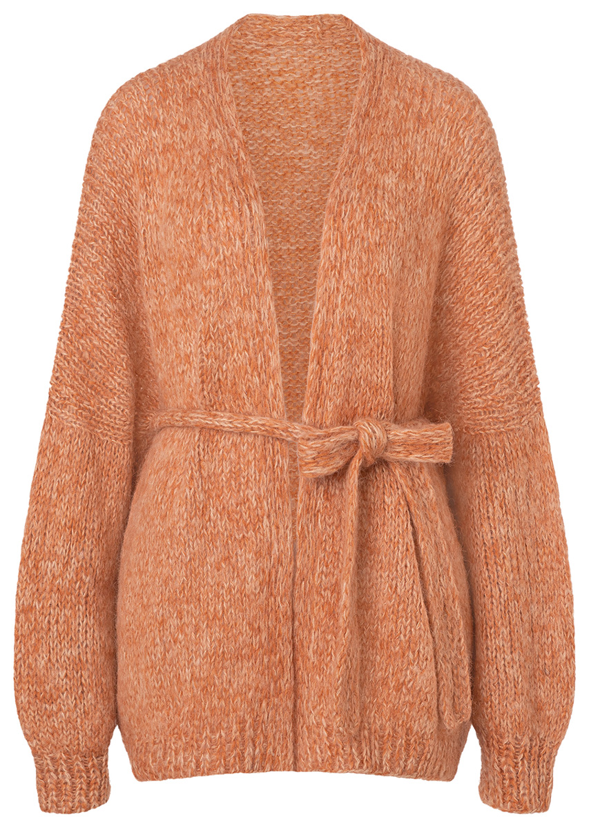 Vores model Bella er 175 cm høj og har en overvidde på 109 cm. Hun bærer Jona Cardiganen i str. XL i Variant 2.