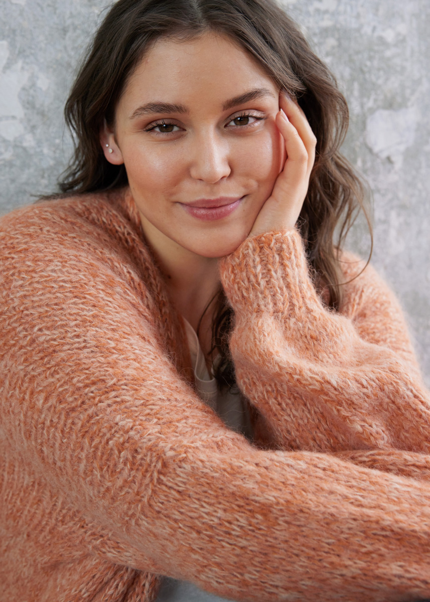Vid cardigan med bælte. Denne cardigan strikkes samlet oppefra og ned. Der begyndes med halskanten bag, og derefter formes forstykkerne med skuldre i vendepinde. Der strikkes udtagninger til den dybe V-hals og indtagninger til de skrå ærmegab. Derefter strikkes ryggen. Til sidst strikkes forstykkerne og ryggen sammen. Ærmerne strikkes direkte på ærmegabene. Via indtagninger får ærmerne et let ballonformet snit og strammes ind ved ærmekanterne. Alle kanter samt bæltet strikkes i vævestrik. Str.: XS (32/34) - S (36/38) – M (40/42) – L (44/46) – XL (48/50) – XXL (52/54) Disse str. svarer til en overvidde på XS (76-80) cm – S (84-88 cm) – M (92-96 cm) – L (100-104 cm) – XL (110-116 cm) – XXL (122-128 cm) Jona Cardiganen har en ekstra vidde på XS (42-38 cm) – S (20- 38 cm) – M (44-40 cm) – L (44-40 cm) – XL (46-40 cm) – XXL (46-40 cm) Tallene vedrørende str. S, M, L, XL og XXL er angivet i parentes. Er der kun oplyst ét tal, gælder dette alle størrelser.