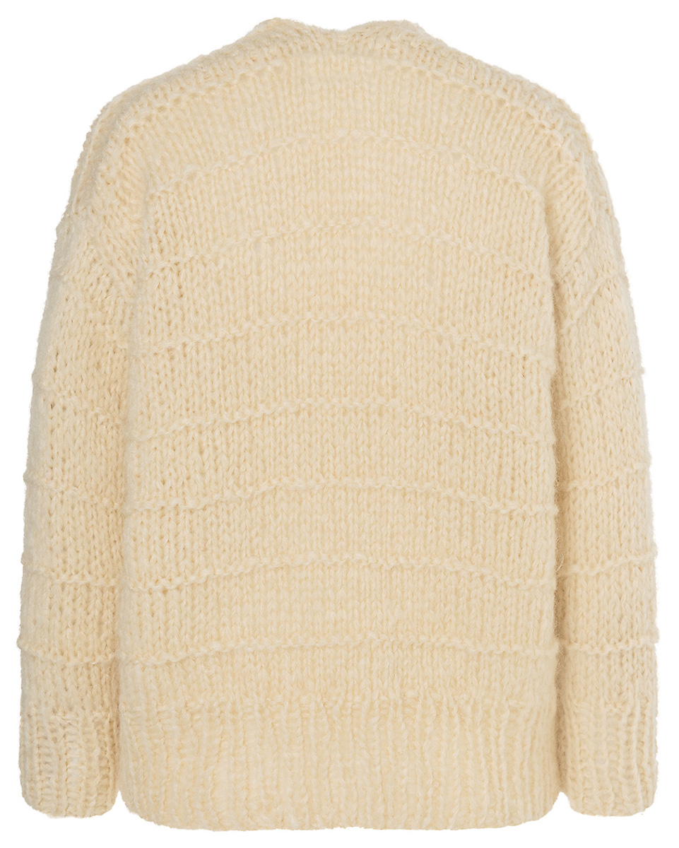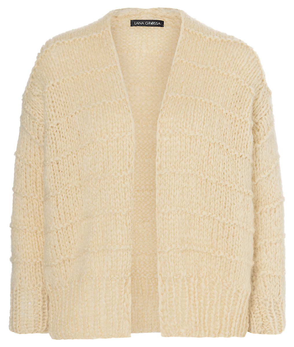 Lana Grossa-kvalitet „Lala Berlin Brushy“ (42 % mohair (superkid), 38 % ren ny ull (merino), 20 % polyamid, löplängd 135 m/50 g): ca. 400 (450 – 500) g beige (färg 7); stickor nr. 10 och 12.