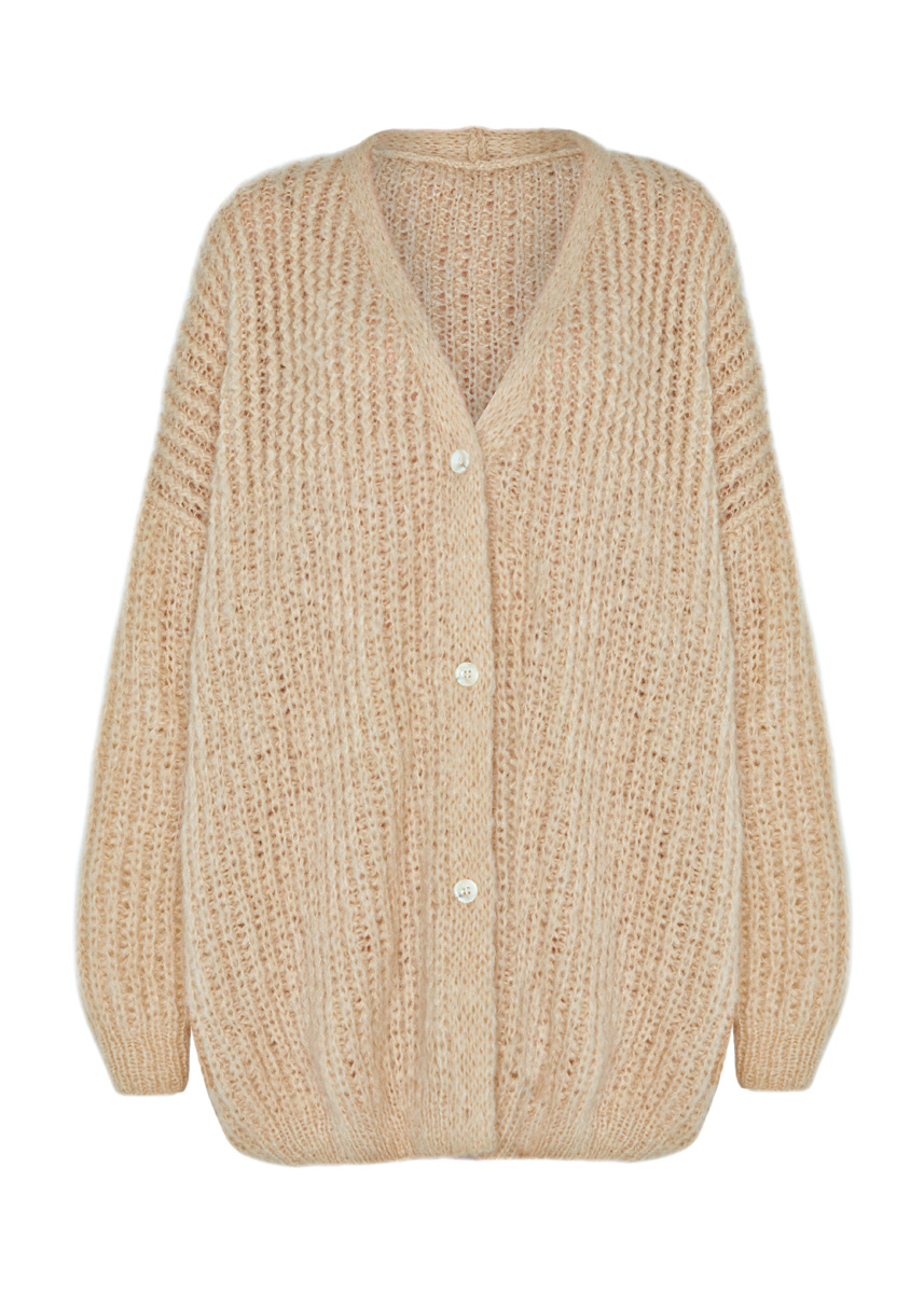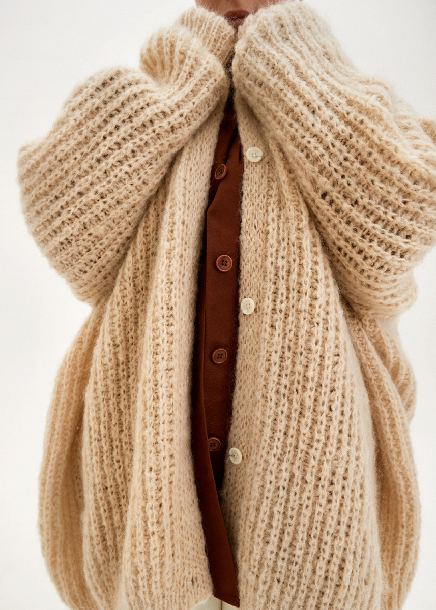 Lana Grossa-kvalitet „Lala Berlin Bru- shy“ (42 % mohair (superkid), 38 % ren ny ull (merino), 20 % polyamid, löplängd 135 m/50 g): ca. 550 g beige (färg 7); stickor nr. 5, 6 och 7; 4 knappar i natur melerad, 4-hål, ø 18 mm.