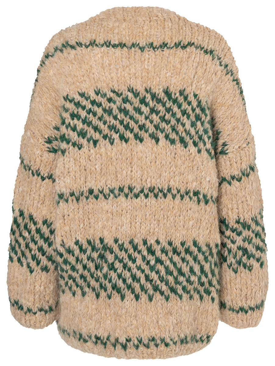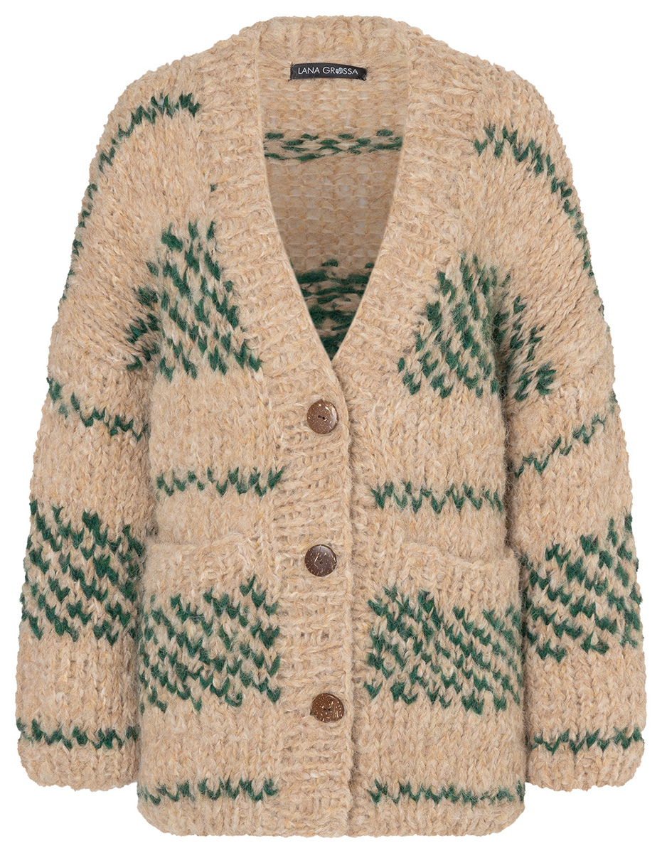 Lana Grossa-kvalitet „Lala Berlin Furry” (90 % (baby) alpacka, 10 % polyamid, löplängd = ca. 75 m/50 g): ca. 400 (450) g beige (färg 2) och ca. 100 (150) g mörk grön (färg 16); stickor nr. 8 och 10, 1 rundsticka nr. 8, 120 cm lång; 3 knappar i mörk brun, ø 30 mm.