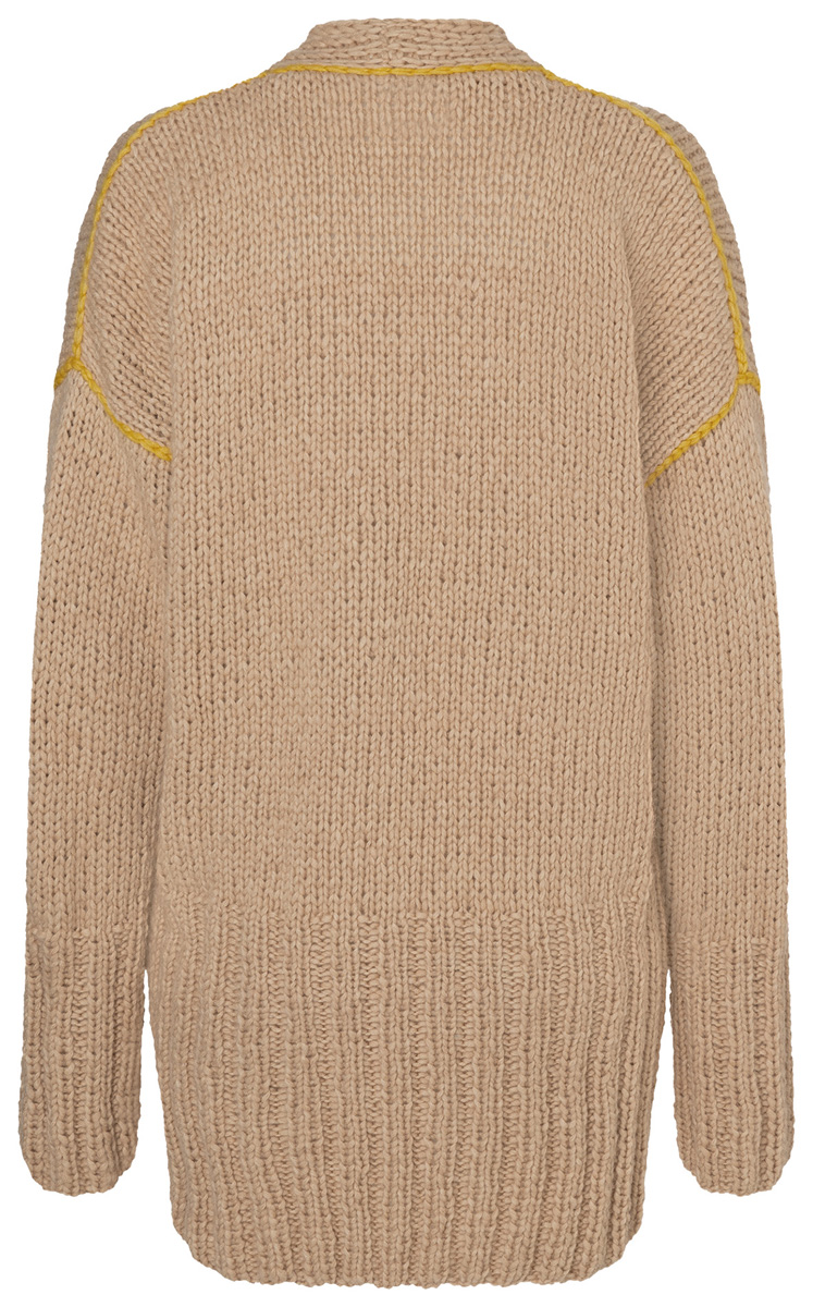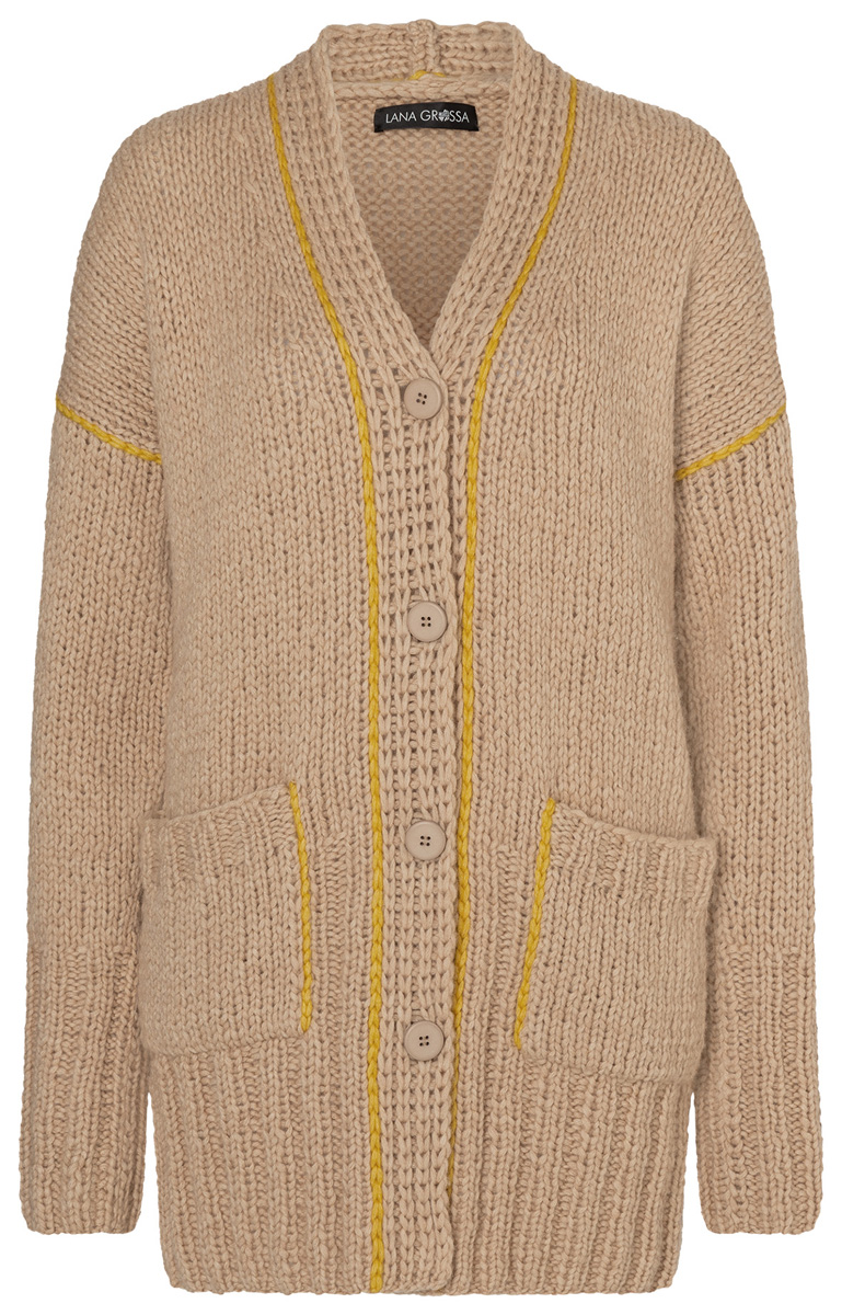 Lana Grossa-kvalitet „Lala Berlin Lovely Cotton” (75 % ren ny ull (Merino superfine), 25 % bomull, löplängd = ca. 90 m/50 g): ca. 650 (700 – 750) g beige (färg 27) och ca. 50 g gul (färg 15); stickor nr. 6 och 8, rundstickor nr. 6 och 8, 60 cm lång, 1 ullnål [synål] nr. 6; 4 knappar i beige, ø 16 mm.
