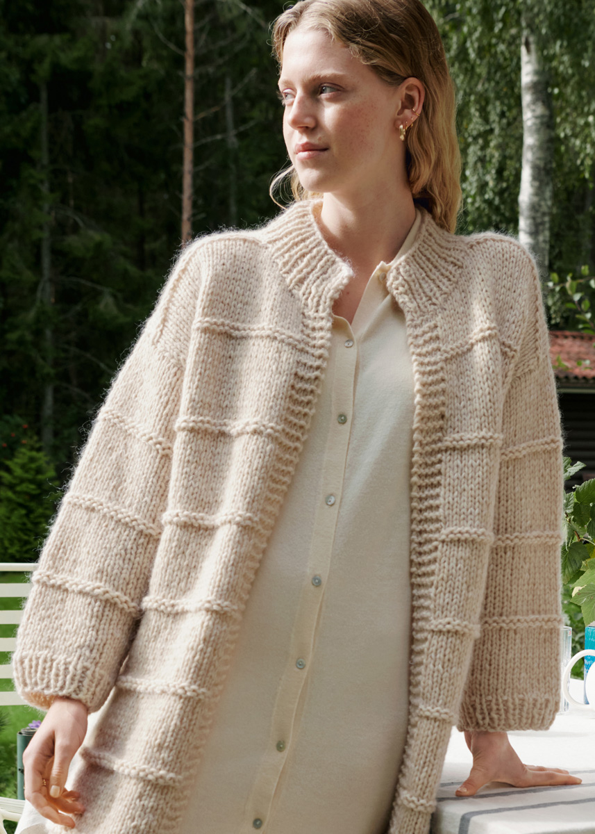 Lana Grossa-kvalitet „Lala Berlin Lovely Cotton“ (75 % ren ny ull (merino superfine), 25 % bomull, löplängd = ca 90 m/50 g): ca 500 (550 - 600) g natur (färg 7); kvalitet „Silkhair“ (70 % mohair superkid, 30 % silke, löplängd = ca 210 m/25 g): ca 100 (125 - 150) g vit (färg 117); stickor nr. 10; 1 rundsticka nr. 10. Modellen stickas med dubbla trådar: 1 tråd av var garn-kvalitet.