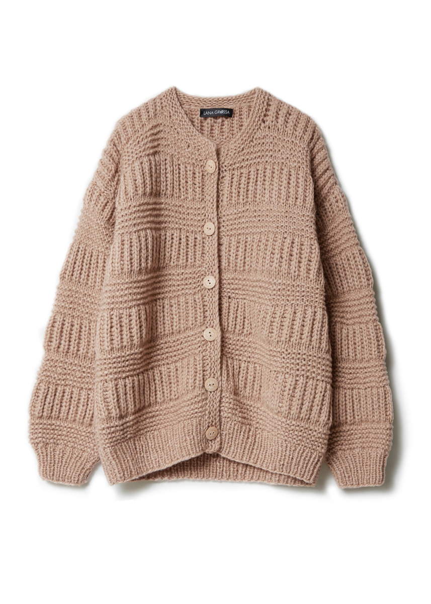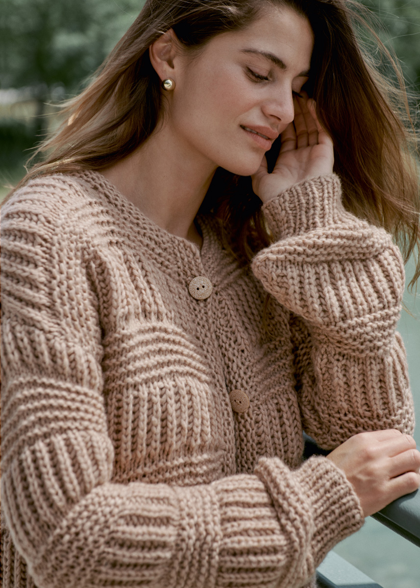 Lana Grossa „Lala Berlin Lovely Cotton“ (75% ren ny ull (merino superfine), 25% bomull, löplängd = 90 m/50 g): 550 (600 - 650) g i beige (färg 27); stickor nr. 5., nr. 6,5 och nr. 8, 1 rundsticka nr. 7, 50 cm lång, 6 knappar från Union Knopf i beige, färg 16, 25 mm Ø, Art. 454240.