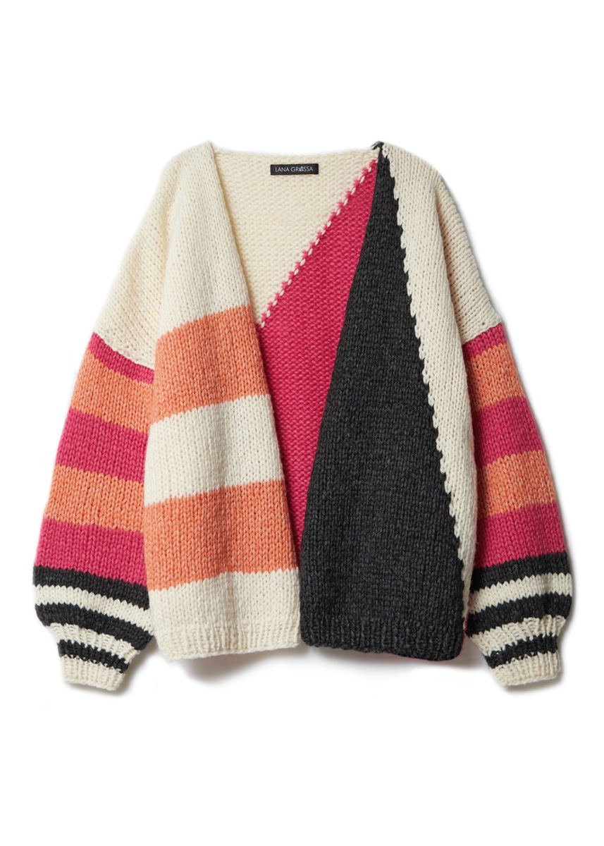 Lana Grossa „Lala Berlin Lovely Cotton“ (75% ren ny ull (merino extrafine), 25% bomull, löplängd 90 m/50 g), 200 (250 – 300) g råvit (färg 33), 200 (250 – 300) g pink (färg 28), 150 (150 – 200) g anthracit (färg 8) och 100 (150 – 150) g koralle (färg 34); stickor nr. 8 och 10 samt 1 virknål nr. 6.