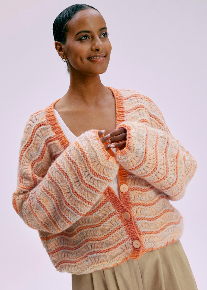 Lana Grossa-kvalitet „Lala Berlin Smoothy“ (62 % alpacka (baby), 27 % polyamid, 11 % ren ny ull (merino fin), löplängd = ca. 135 m/50 g): ca. 450 (500) g persika/ljusbeige (färg 4); Lana Grossa-kvalitet „Lala Berlin Lovely Cotton“ (75 % ren ny ull (merino superfin), 25 % bomull, löplängd = ca. 90 m/50 g): ca. 100 (150) g korall (färg 34); stickor nr. 7; 1 långa rundsticka nr. 7; 3 knappar i aprikos färg 0042, 25 mm diameter, Art-Nr 453037 från Union-Knopf. Tips: Lala Berlin Smoothy stickas med dubbla trådar.