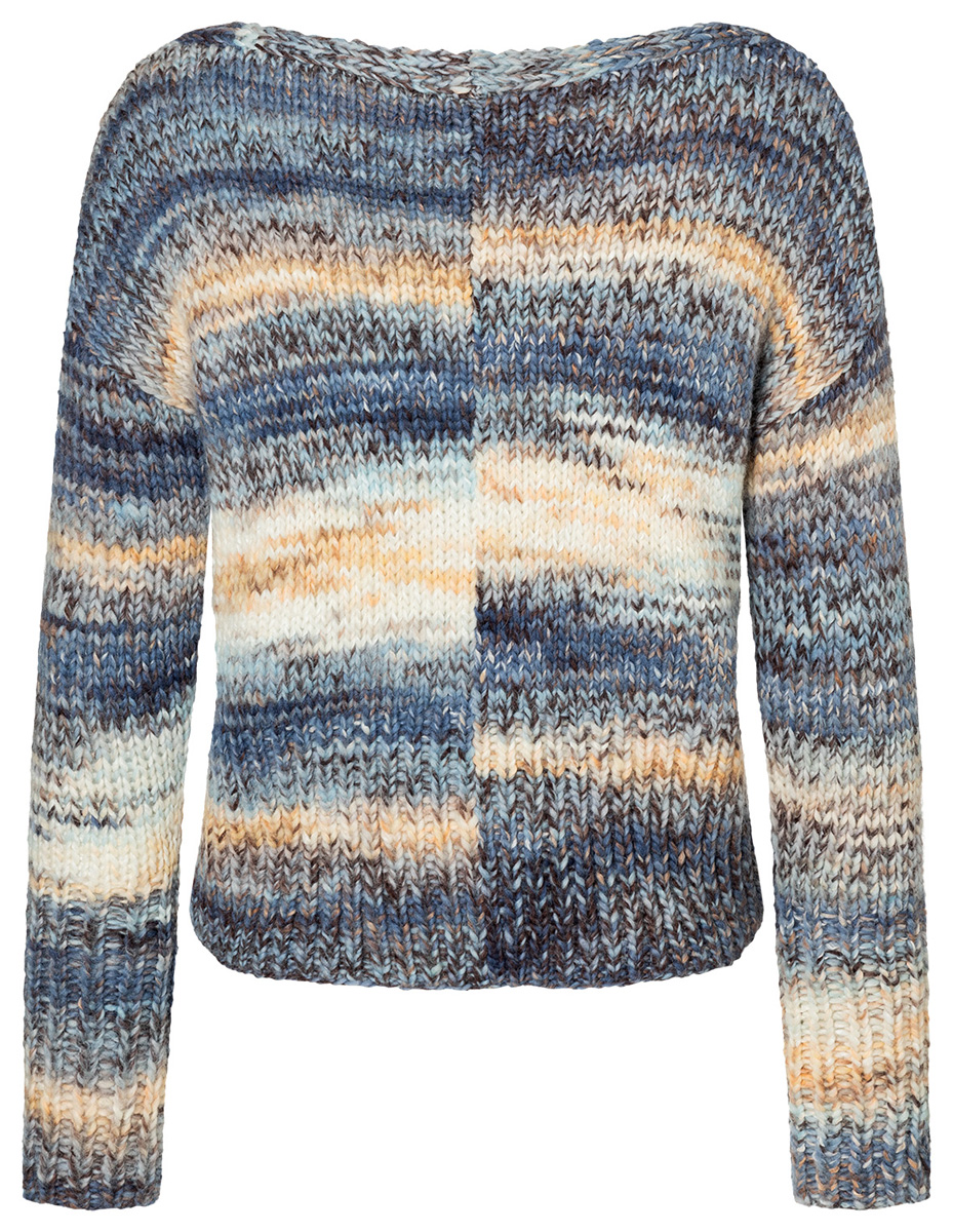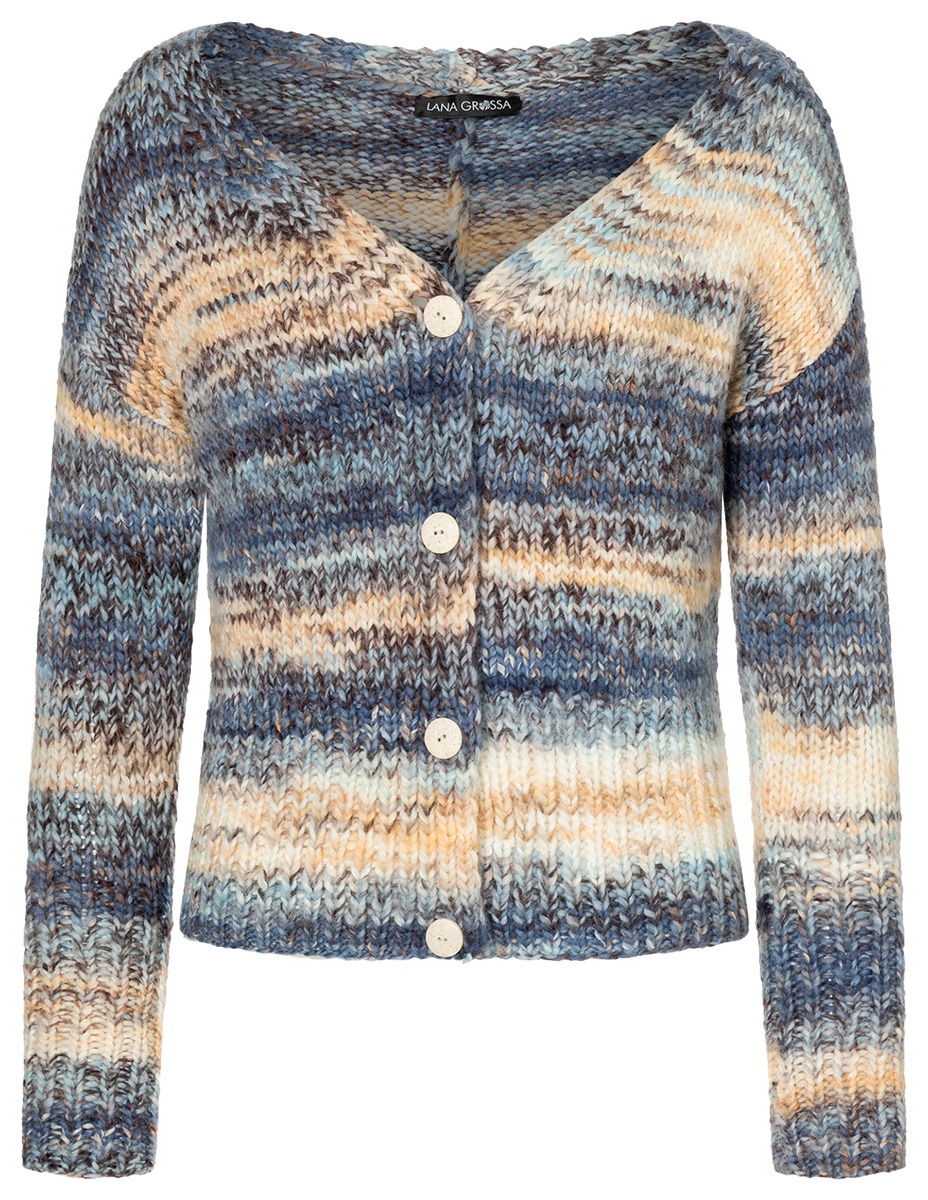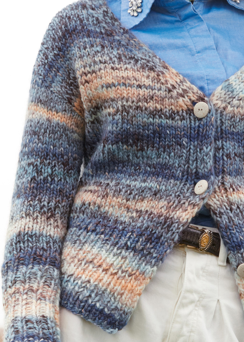 Lana Grossa-kvalitet „Lala Berlin Stripy” (56 % ren ny ull (merino), 29 % polyacryl, 14 % (baby) alpacka, 1 % elastan, löplängd = ca. 90 m/50 g): ca. 350 (400 – 450) g ljus blå/blå/marin/beige/taupe/vit (färg 2); stickor nr. 6,5 och 7,5; 4 knappar i natur, ø 22 mm.
