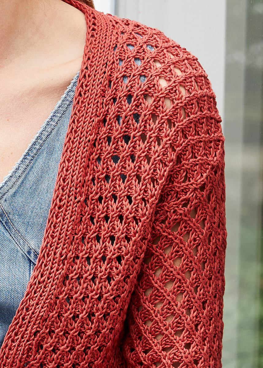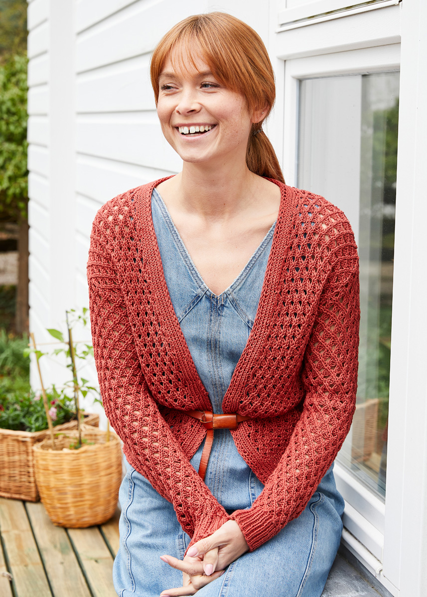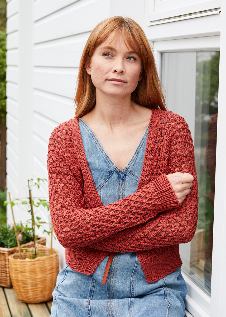 Lana Grossa-kvalitet „Landlust Baumwolle“ (100% Bio bomull, löplängd ca. 115 m/50 g), 450 (500 - 550 - 600) g i roströd (färg 7); stickor nr. 4 och nr. 4,5.