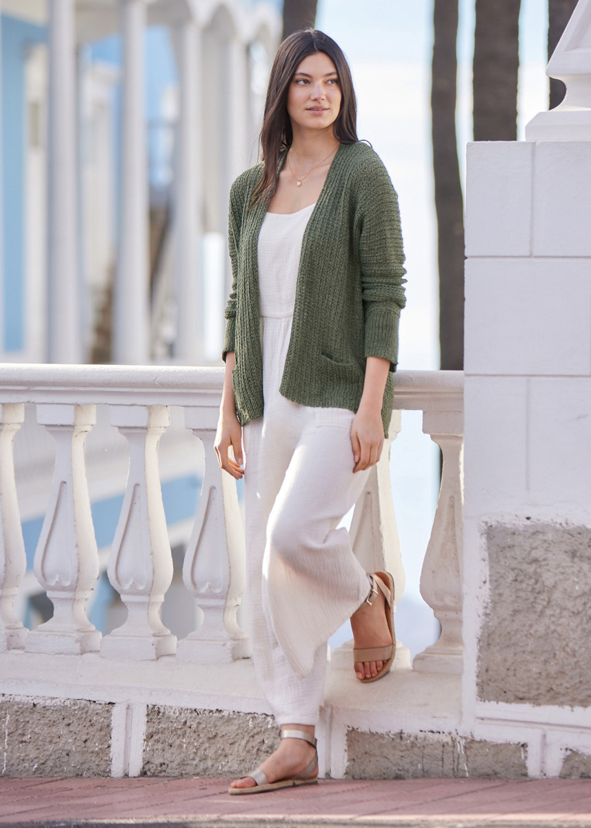 Lana Grossa-kvalitet „Landlust Sommerseide“ (50% silke, 50% bomull, löplängd ca. 170 m/50 g), 500 (550-600) g i mörkgrön/beige (färg 30); rundstickor nr. 3,5 och nr. 4, 100 lång.