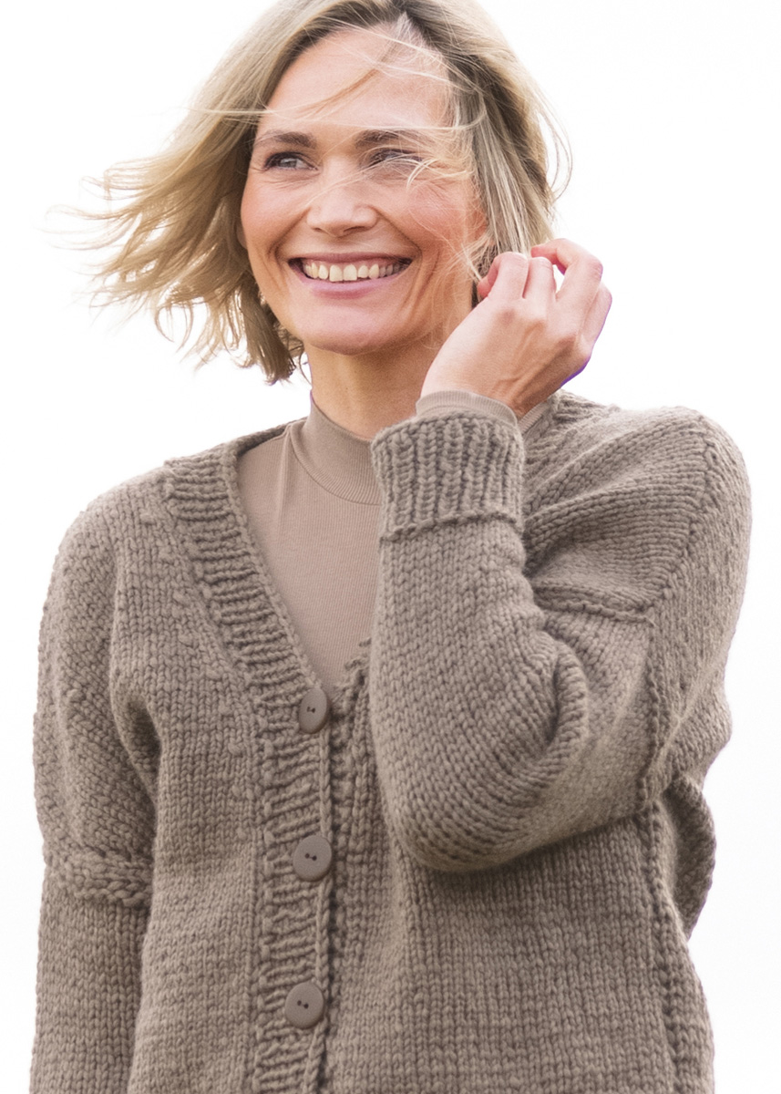 Lana Grossa Landlust Winterwolle (50 % ren ny ull (merino), 35 % bomull, 15 % jak, löplängd = ca 70 m/50 g); ca. 450 (500 - 550) g gråbrun melerad (färg 20); stickor nr. 6 och 7; kort rundsticka nr. 7(40 cm lång); strumpstickor nr. 6; 3 knappar i brun, 25 mm Ø.