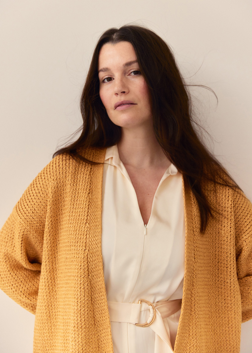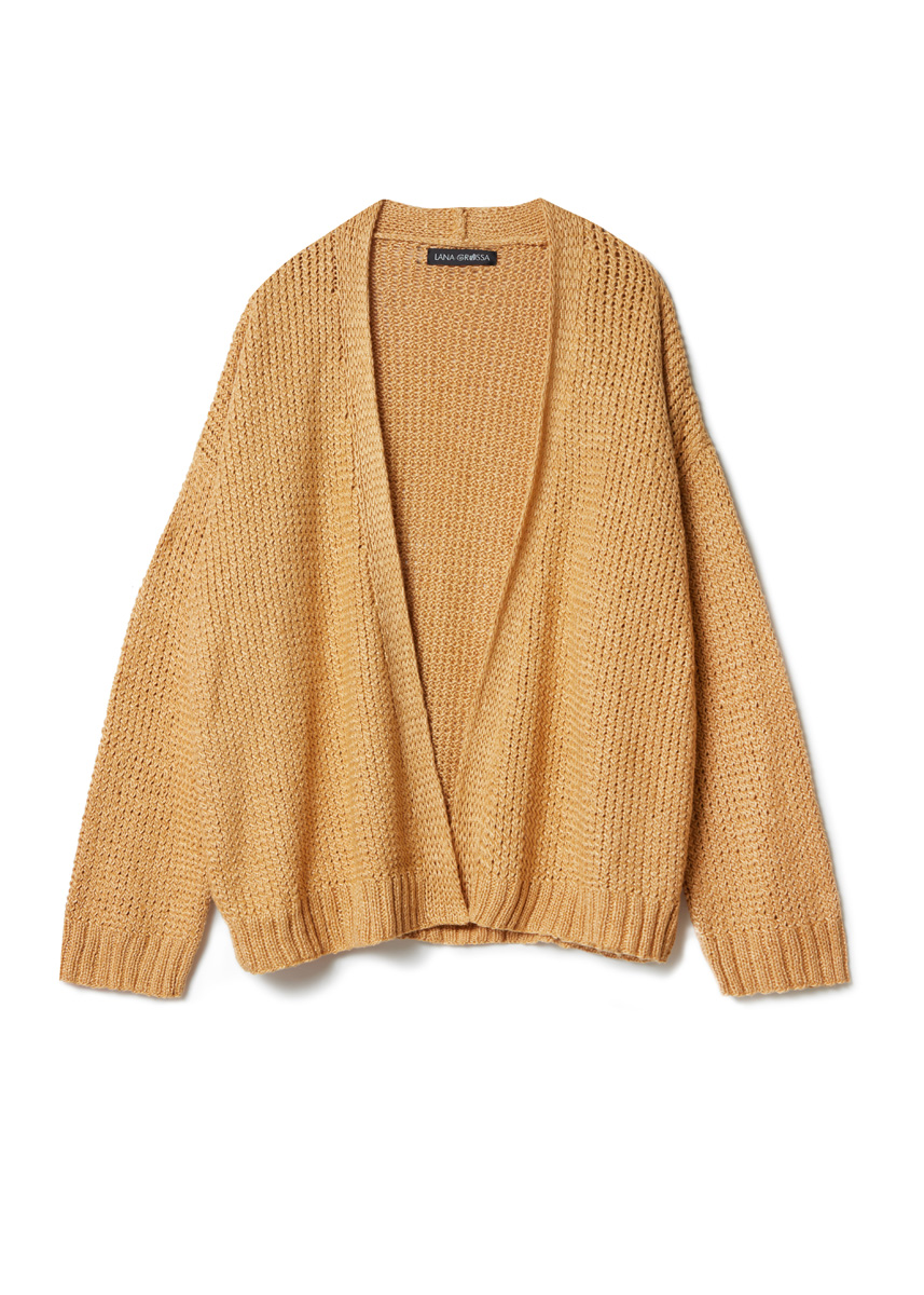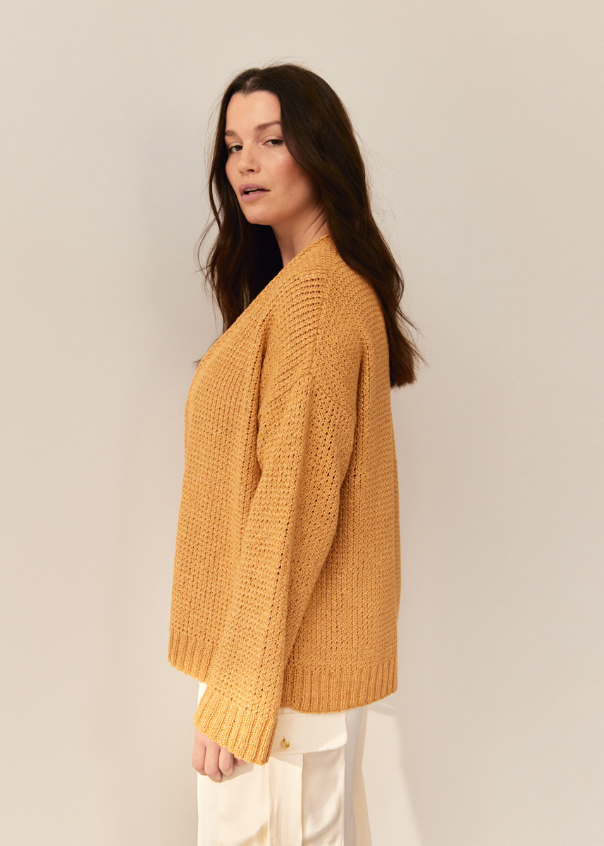 Lana Grossa Linarte (40% viskos, 30% bomull, 20% lin, 10% polyamid, löplängd 125 m/50 g), 600 (650 – 700 – 750) g honungsgul (färg 326); stickor nr. 4,5.