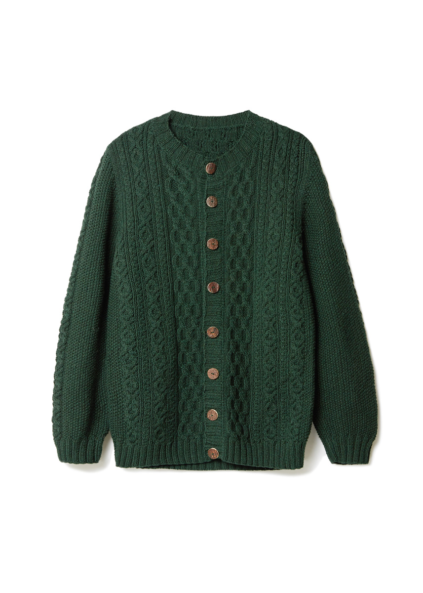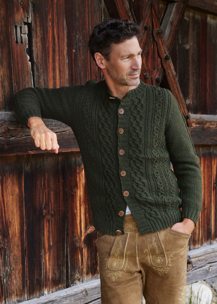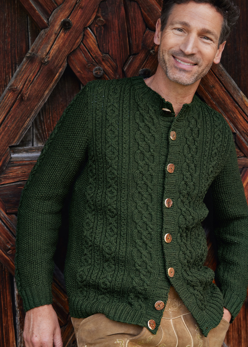 Lana Grossa Cool Wool (100% Schurwolle (Merino extrafine), Lauflänge 160 m/50 g), 800 (850 – 900) g Dunkeloliv (Fb 2042); Stricknadeln Nr. 3,5 und 1 Rundstricknadel Nr. 3, 80 cm lang, 1 Häkelnadel Nr. 3, 1 Zopfnadel, 8 Hirschhorn-Knöpfe von UNION KNOPF, Ø 23 mm.