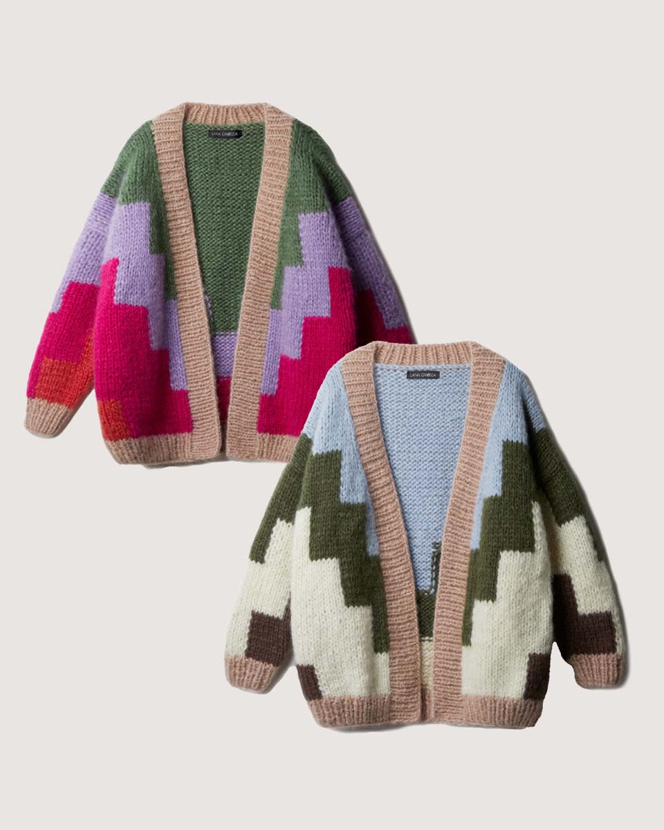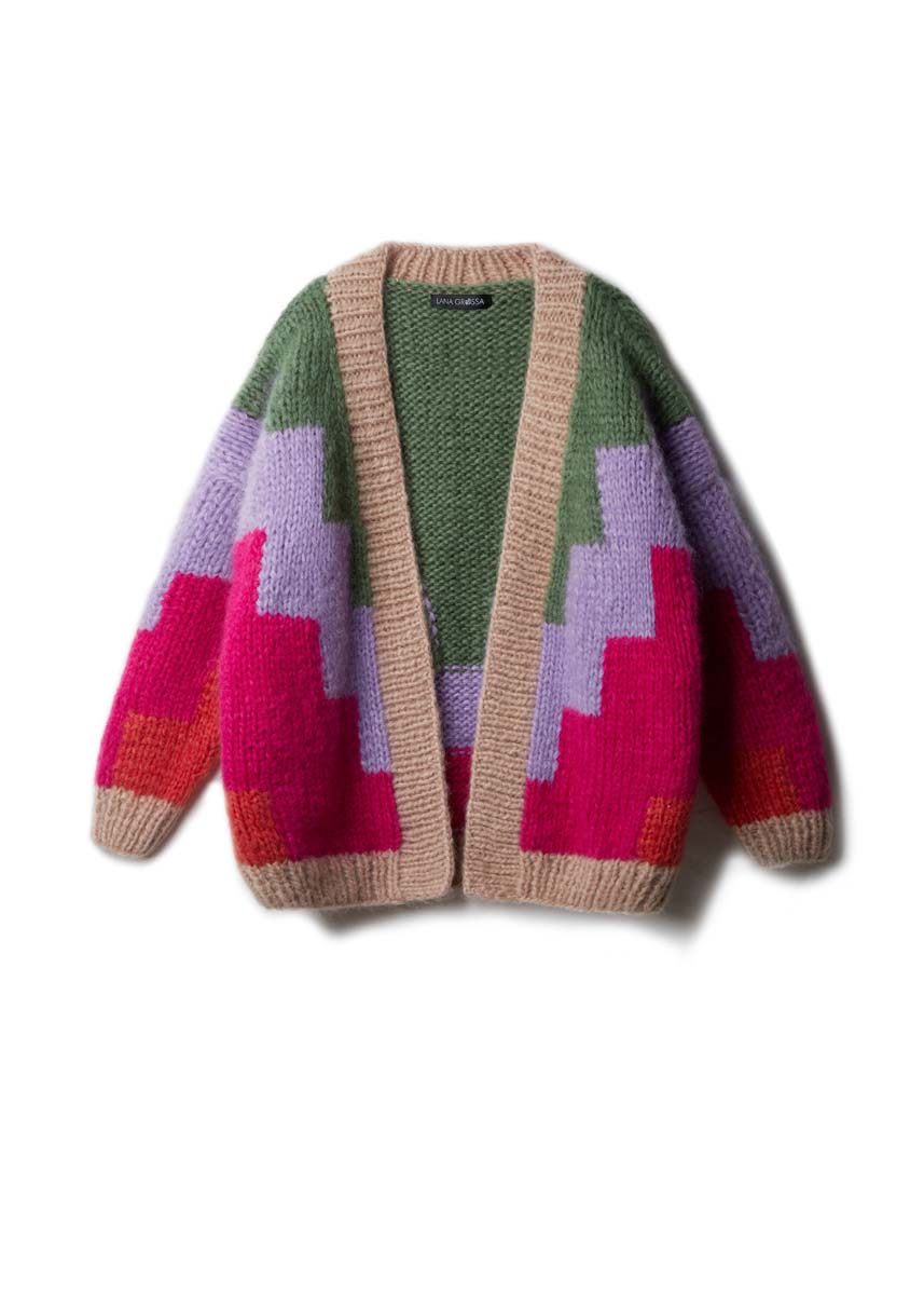 Lana Grossa Mohair di Gio (55% mohair (superkid), 45% ren ny ull (merino superfin), løpelengde = ca. 85 m/50 g), 300 (350 - 400) g i pink (farge 3), 200 (200 - 250) g hver i beige (farge 8) og syrinlilla (farge 1), 100 (150 - 150) g i resedagrønn (farge 13) og 100 g i oransjerød (farge 6); strikkepinne nr. 8 og nr. 10; 1 lang rundpinne nr. 8 (for frontpanelet).