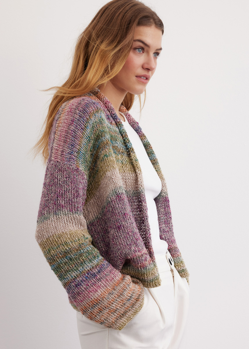 Lana Grossa „Mosaico“ (54 % bomull, 23 % lin, 23 % viskos, löplängd 270 m/100 g), 500 (600) g gråbeige/grå/fuchsia/pink/mörkoliv/orange (färg 6); stickor nr. 3,5 och 4.
