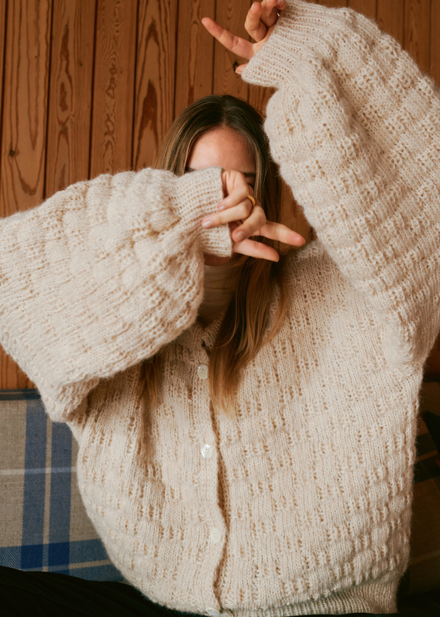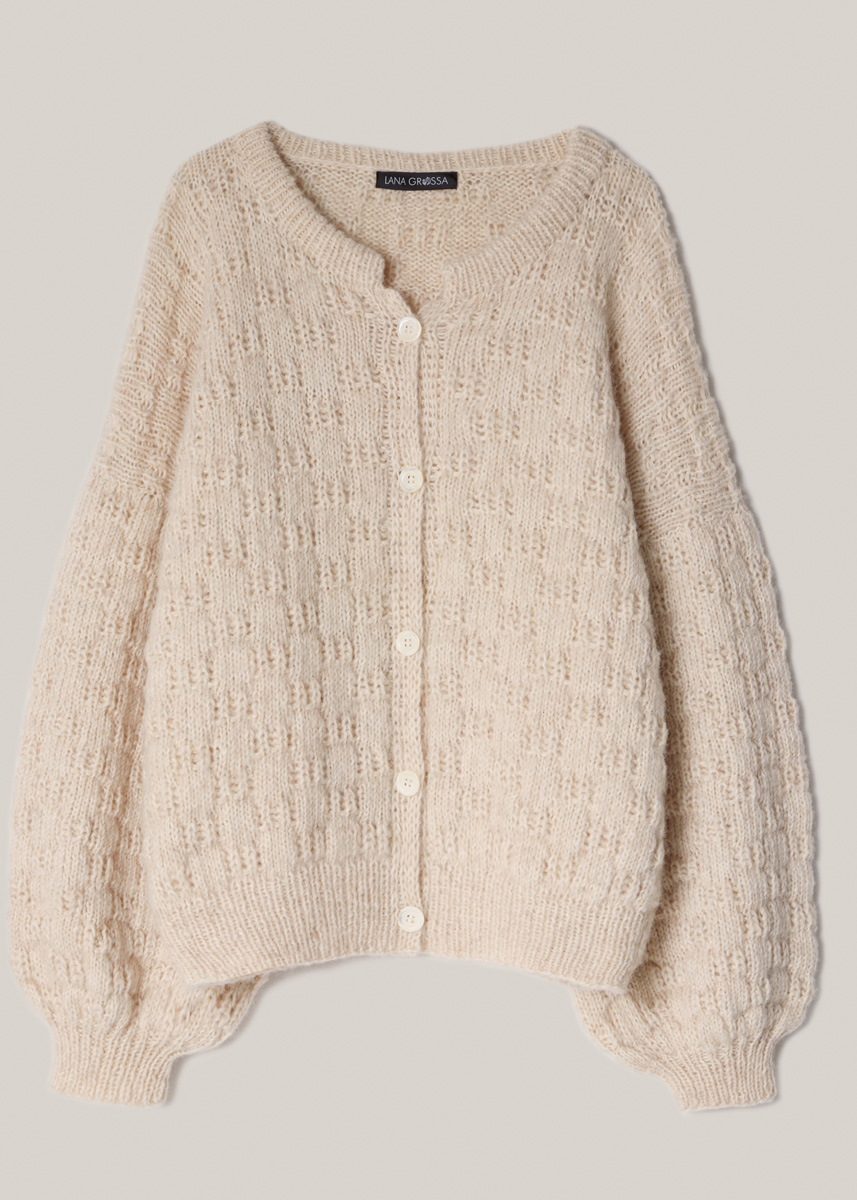 Lana Grossa-kvalitet „Natural Alpaca Pelo” (63 % bomull, 31 % (baby) alpacka, 6 % ren ny ull (merino), löplängd = ca. 125 m/50 g): ca. 550 (600) g råvit/mjukbeige (färg 5); rundstickor nr. 5, 50 och 100 cm lång, 1 rundsticka nr. 3,5 (4,5), 100 cm lång, strumpstickor nr. 3,5; 5 pärlemorknappar i natur, ø 20 mm.