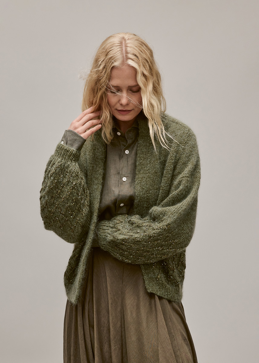 Garn: Lana Grossa Natural Lama Fine (100 % lama (baby), LL = 150 m / 50 g): 350 g olivengrønn (frg 119), Lana Grossa Silkhair (70 % mohair (superkid), 30 % silke, LL= 210 m/25 g: 125 g mosegrønn (frg 127) og Lana Grossa Glamour (55 % polyamid, 45 % polyester, LL = 115 m / 25 g): 200 g oliven (frg 17). Pinner: Rundpinne 3,5 og 4,5 mm, 80–100 cm lang (strikk omg med liten omkrets enten med teknikken magic loop eller på kortere rundpinne 3,5 og 4,5 mm). Tilbehør: 4 maskemarkører