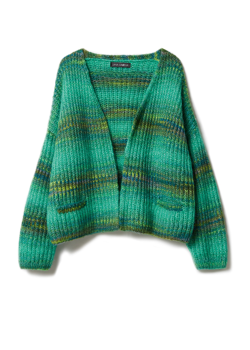 Lana Grossa-kvalitet „Picasso“ (36 % ren ny uld (ekstrafin merino), 36 % alpaka (baby) 28 % polyamid, løbelængde = ca. 210 m / 50 gr.): 300 (350 – 400 – 450) gr petrol/ oliven/smaragd/jade/grøn (fv 1), strikkepinde nr. 5 og 5½.