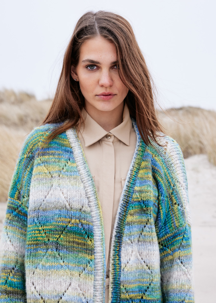 Lana Grossa-kvalitet „Picasso“ (36% ren ny ull (merino extrafin), 36 % alpacka (baby), 28 % polyamid, löplängd = ca 210 m/50 g): ca 350 (450 - 550) g silbergrå/vit/vanilj/ljusblå/ ljusgrå/ljusgrön/mörkgrön/oliv/limette (färg 2); stickor nr. 5; 1 lång rundsticka nr. 5.