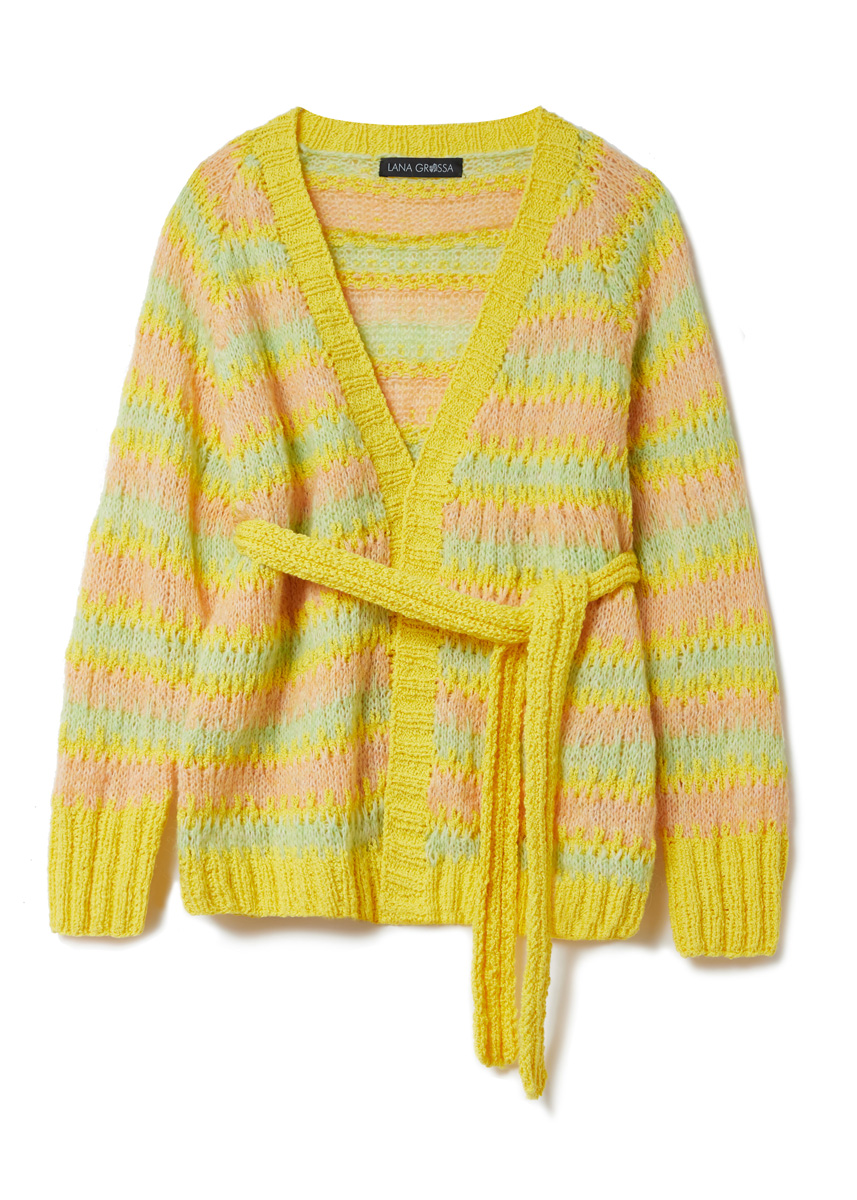 Lana Grossa „Riccio“ (84 % bomull, 16 % polyamid, löplängd 110 m/50 g), 200 g gul (färg 14); Lana Grossa „Bella“ (35 % bomull, 30 % nylon, 25 % alpacka (baby), 10 % ren ny ull (merino), löplängd 250 m/25 g), 50 g aprikos (färg 6), 50 g mjukgrön (färg 20); stickor nr. 5,5 och 6, rundsticka nr. 5,5 100 cm lång.
