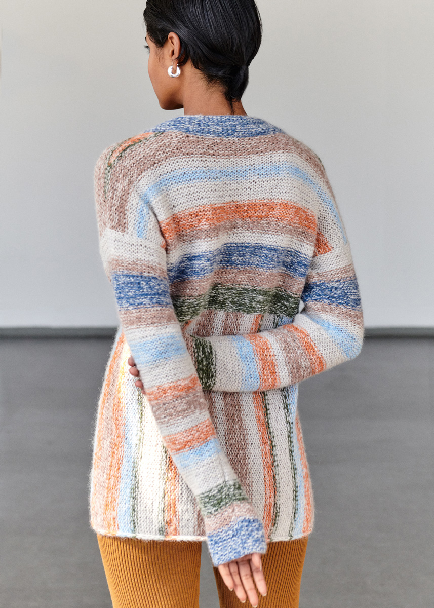 Lana Grossa „Setasuri“ (69 % alpacka (Suri), 31% silke, löplängd 212 m/25 g), 125 (150 – 150) g Creme (färg 2); Lana Grossa „Ecopuno“ (72 % bomull, 17 % ren ny ull (merino), 11 % alpacka (baby), löplängd 215 m/50 g), 100 (100 – 150) g Silbergrå (färg 45) , 100 g kamel (färg 32), 50 g loden (färg 1), 50 g jaffaorange (färg 5) , 50 g himmelsblå (färg 69) , 50 g mörkblå (färg 76); stickor nr. 4 och 4,5; 3 duffelknapp (längd 4 cm)