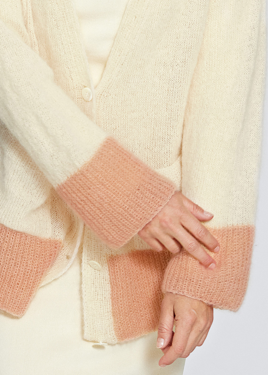 Lana Grossa Setasuri (69% alpacka Suri, 31% siden, löplängd 212 m/25 g), 150 (175 – 175) g creme (färg 2) och 50 (75 – 75) g persika (färg 3); stickor nr. 3,5 och 4 knappar från UNION KNOPF, färg creme, storlek 20 mm.