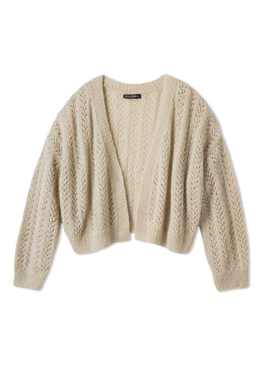 Garn: Lana Grossa «Setasuri» (69 % alpakka (suri), 31 % silke, LL = ca. 212 m/25 g): Ca. 250 (250 - 275) g perlebeige (frg 36) Pinner: Nr. 4 og nr. 5, lang rundpinne nr. 4 Cardiganen blir strikket frem og tilbake med dobbel tråd i flere deler, til slutt sys delene sammen, for å få bedre hold i plagget.