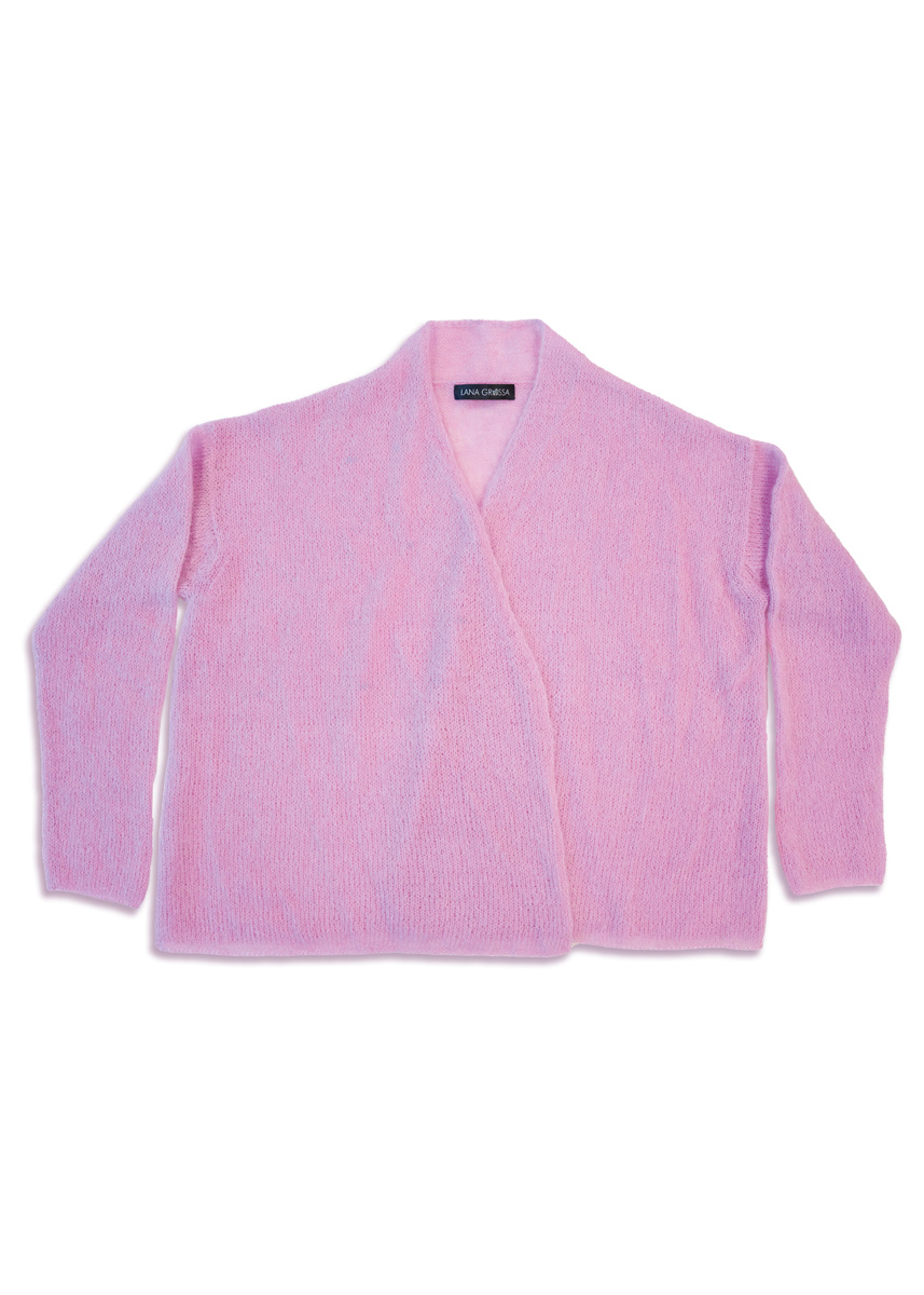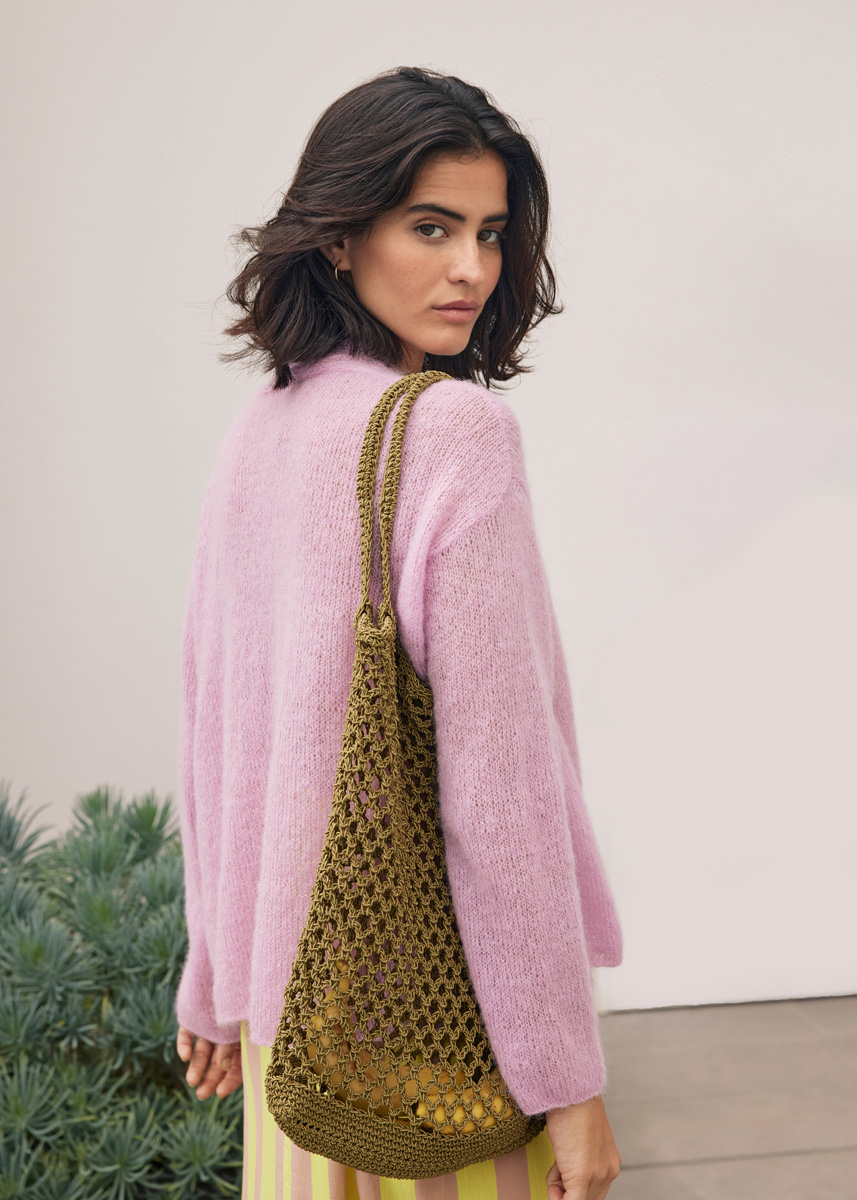 Lana Grossa „Setasuri“ (69% alpacka (Suri), 31% silke, löplängd 212 m/25 g), 150 g geraniumrosa (färg 47); stickor nr. 3,5.