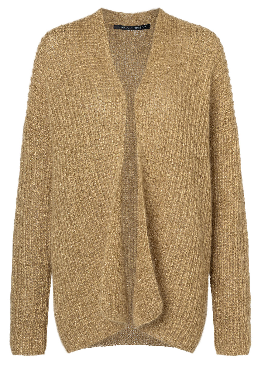 Lana Grossa Silkhair (70% mohair, 30% silke, löplängd 210 m/25 g), 200 (225 – 250) g sandgul (färg 153) och Lana Grossa Brillino (83% viskos, 17% metallfibrer, löplängd 200 m/25 g), 200 (225 – 250) g kamel/guld (färg 4); stickor nr. 4 och 4,5.