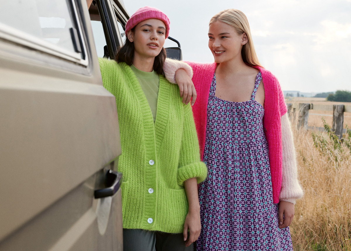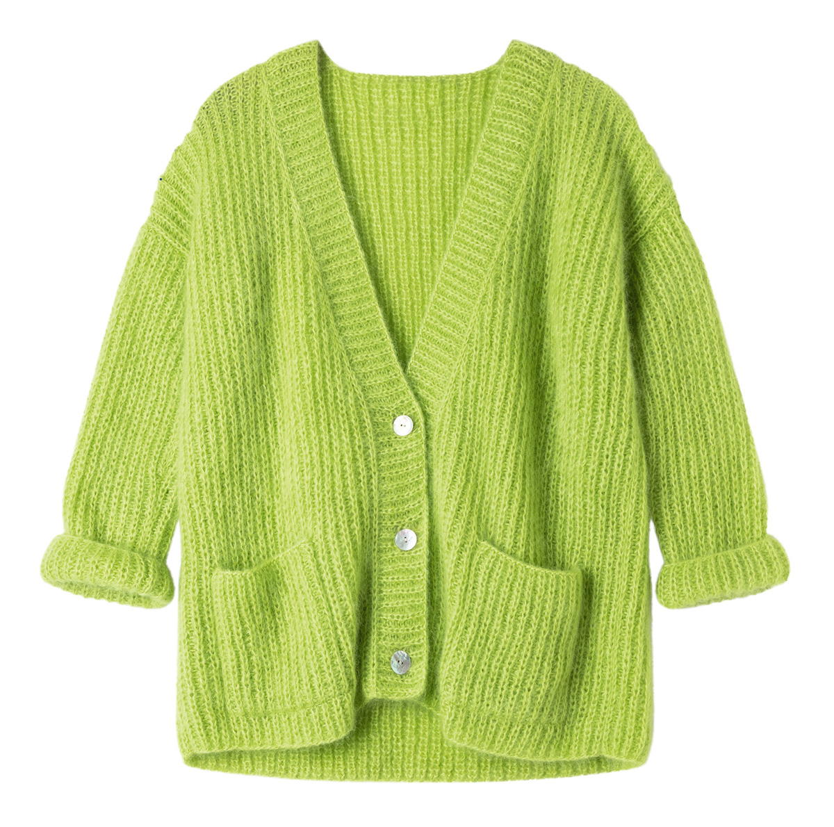 Lana Grossa Silkhair (70% mohair (superkid), 30% silke, löplängd 210 m/25 g), 450 (500 – 550) g Signalgrün (färg 157); stickor nr. 4,5 och 1 rundsticka nr. 4,5, 80 cm lång, samt 3 knappar från UNION KNOPF, Art. 37604, Fb 12, Ø 23 mm.