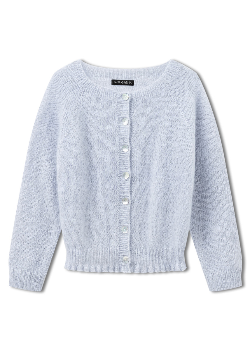 Lana Grossa Silkhair (70% Mohair, 30% silke, löplängd 210 m/25 g), 225 (275 – 325) g reflexgrå (färg 189); rundstickor nr. 3,5 och 4, 40 och 80 cm lång, samt 7 knappar från UNION KNOPF, Art. 37604, färg 12, Ø 20 mm. Modellen stickas med dubbla trådar!