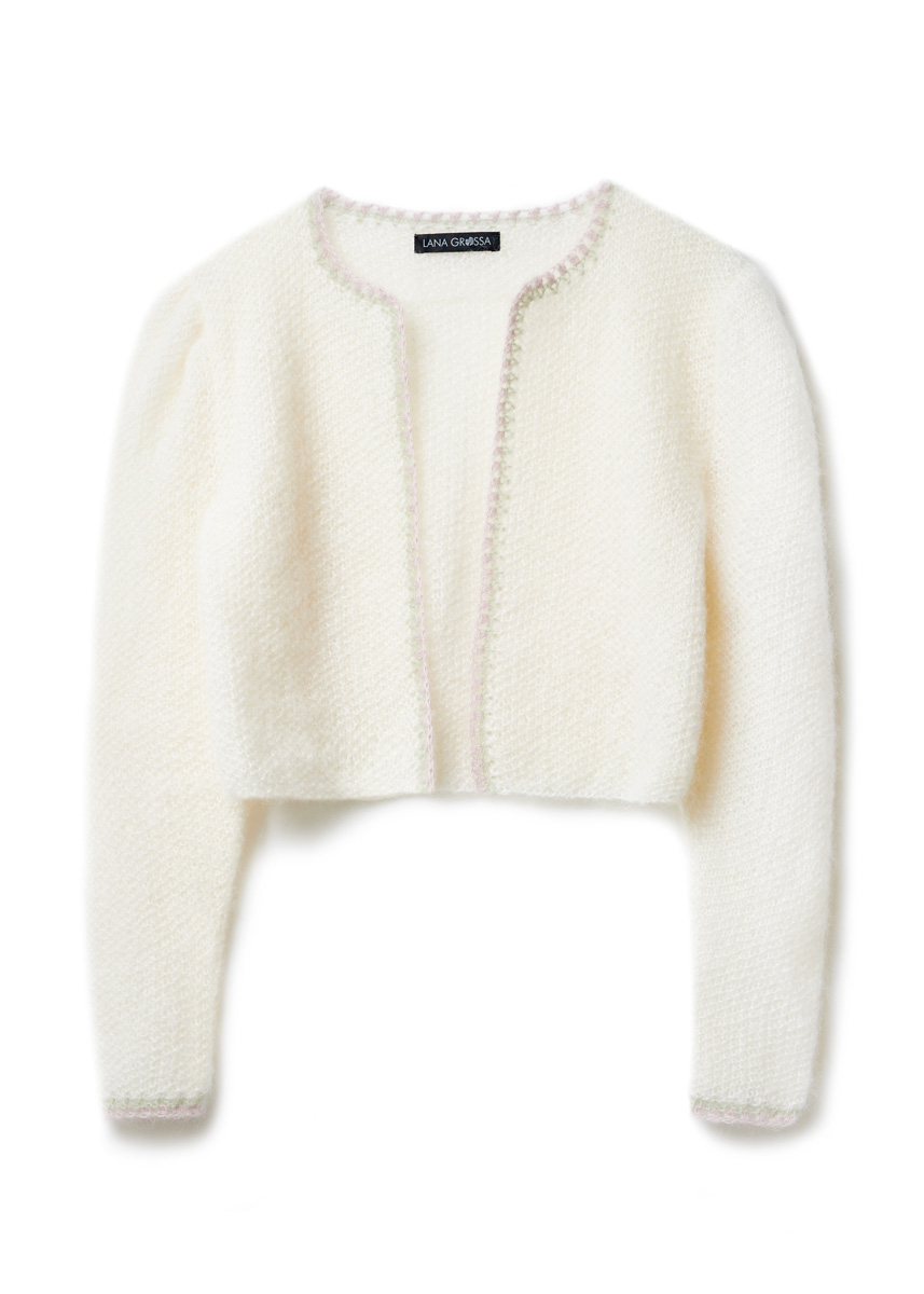 Lana Grossa Silkhair (70% Mohair (Superkid), 30% Seide, Lauflänge 210 m/25 g), 175 (200 – 225) g Weiß (Fb 117), 25 g Pastellflieder (Fb 150) und 25 g Weißgrün (Fb 140); Stricknadeln Nr. 4,5 und 1 Häkelnadel Nr.3,5.