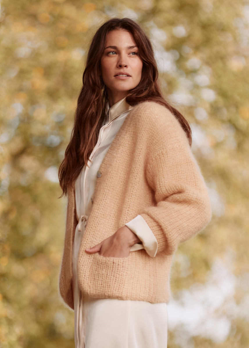 Lana Grossa-kvalitet „Silkhair“ (70 % mohair (superkid), 30 % silke, löplängd = ca 210 m/25 g): ca 275 (300 - 325 - 350) g persika (färg 195); stickor nr 4 och nr 4,5; 1 lång rundsticka nr 4,5; 4 pärlemorknappar, färg 12, 23 mm diameter, Art-Nr 37604 från Union Knopf. Cardiganen stickas med dubbla trådar.