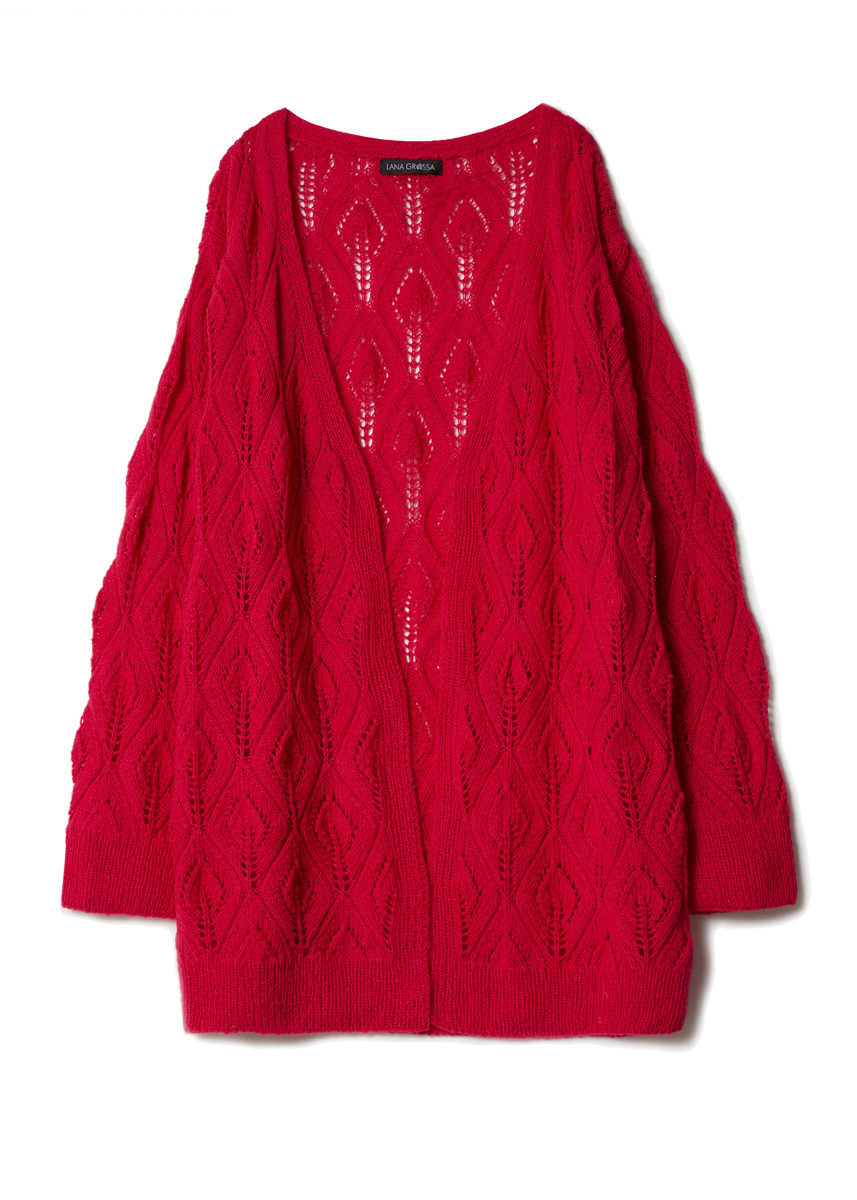 Lana Grossa „Sottile“ (85% bomull, 15% ren ny ull (merino), löplängd = 250 m/50 g): 400 g i hallonröd (färg 5); stickor nr. 3 och nr. 4.