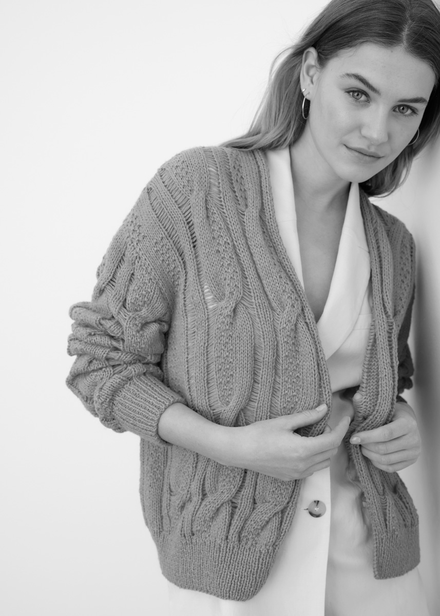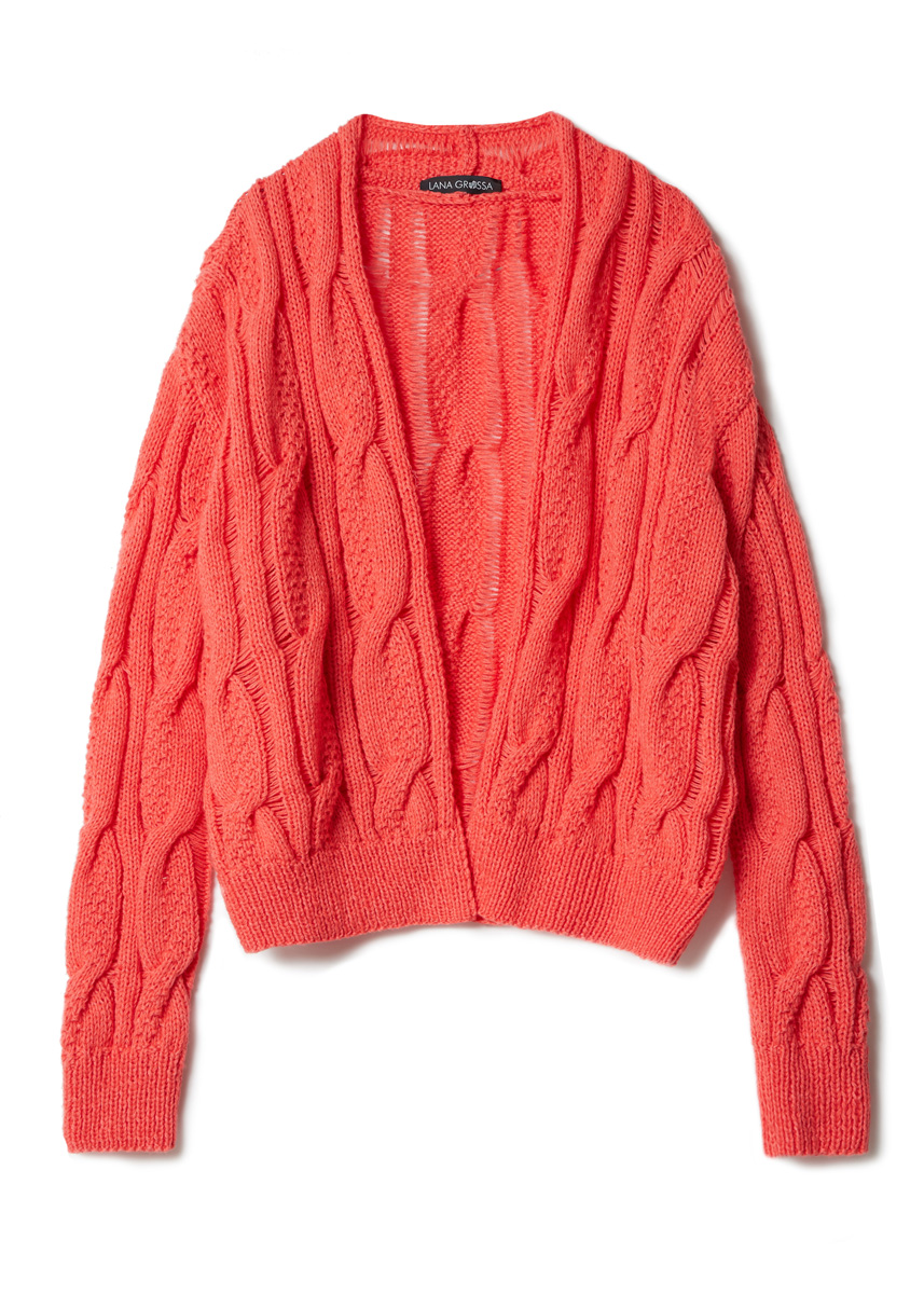 Lana Grossa „Sottile“ (85% bomull, 15% ren ny ull (merino), löplängd = 250 m/50 g): 500 g i korall (färg 3); stickor nr. 3 och nr. 5, 1 flät- eller hjälpsticka.