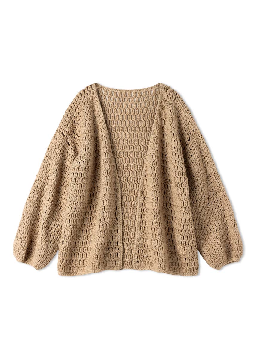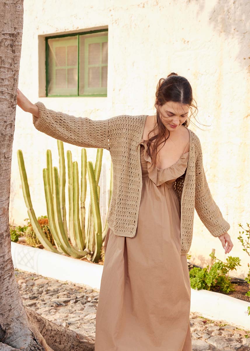 Lana Grossa „Summer Softness“ (80% bomull (bio), 20% ren ny ull (merino superfin), løpelengde 130 m/50 g), 500 (550 - 600) g i beige (farge 3); heklenål nr. 5.
