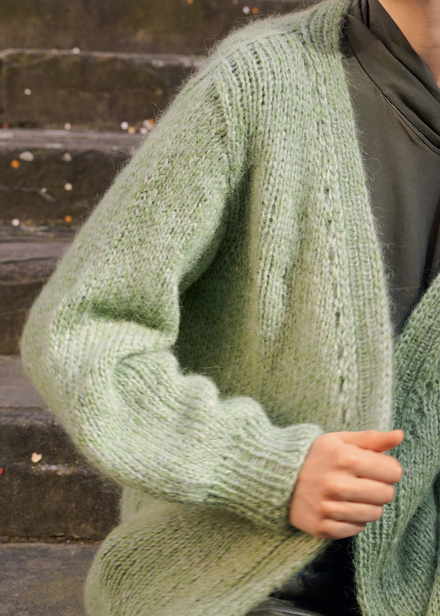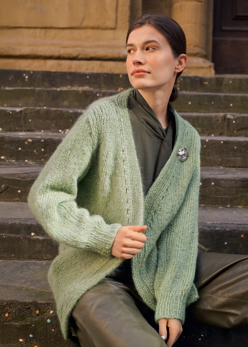 Garn: Lana Grossa «Superkid Seta» (65 % mohair (superkid), 35 % silke, LL = ca. 100 m/25 g): Ca. 200 (225 - 250 - 275) g grågrønn (frg 17), Lana Grossa «Setasuri» (69 % alpakka (suri), 31 % silke, LL = ca. 212 m/25 g): Ca. 100 (125 - 125 - 150) g eplegrønn (frg 72) og ca. 100 (125 - 125 - 150) g lys sjøgrønn (frg 41).