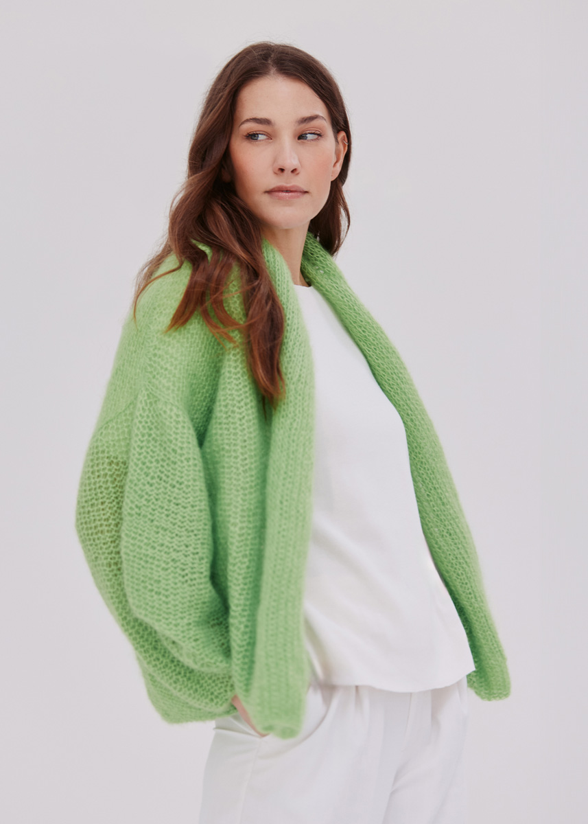 Lana Grossa-kvalitet „Silkhair“ (70 % mohair (superkid), 30 % silke, löplängd = ca 210 m/25 g): ca 250 (275 - 300 - 325) g vårgrön (färg 191); stickor nr 6; 1 kort rundsticka nr 6; 1 maskmarkörer; 1 virknål nr 6.
